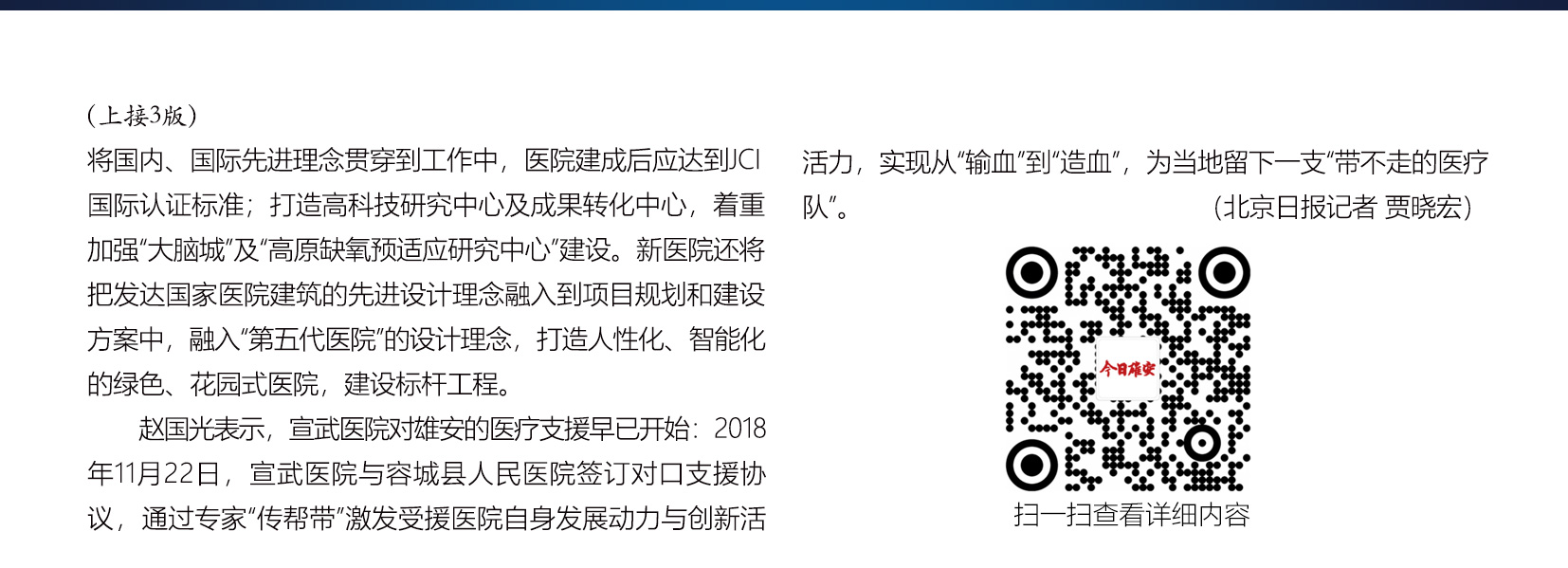 综合医院总建筑面积为12.2万平方米,建成后,将由雄安新区和北京市共同委托首都医科大学宣武医院受托管理,并由雄安新区负责,确保医院具备运行服务条件。
