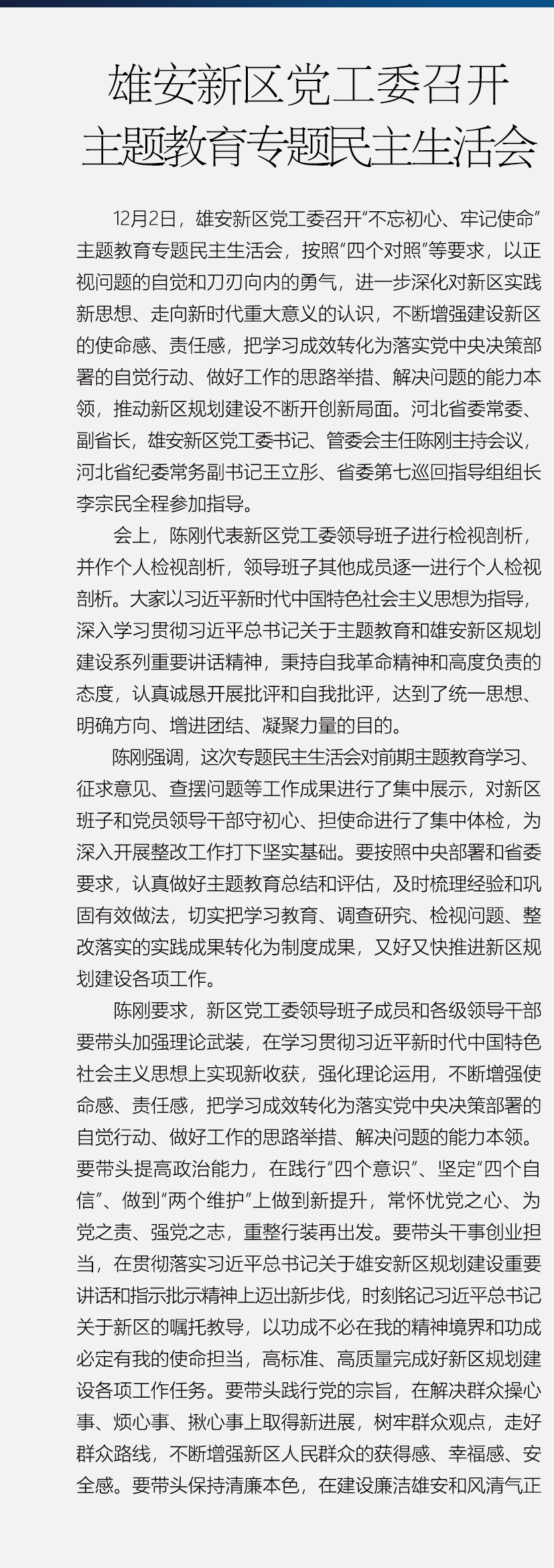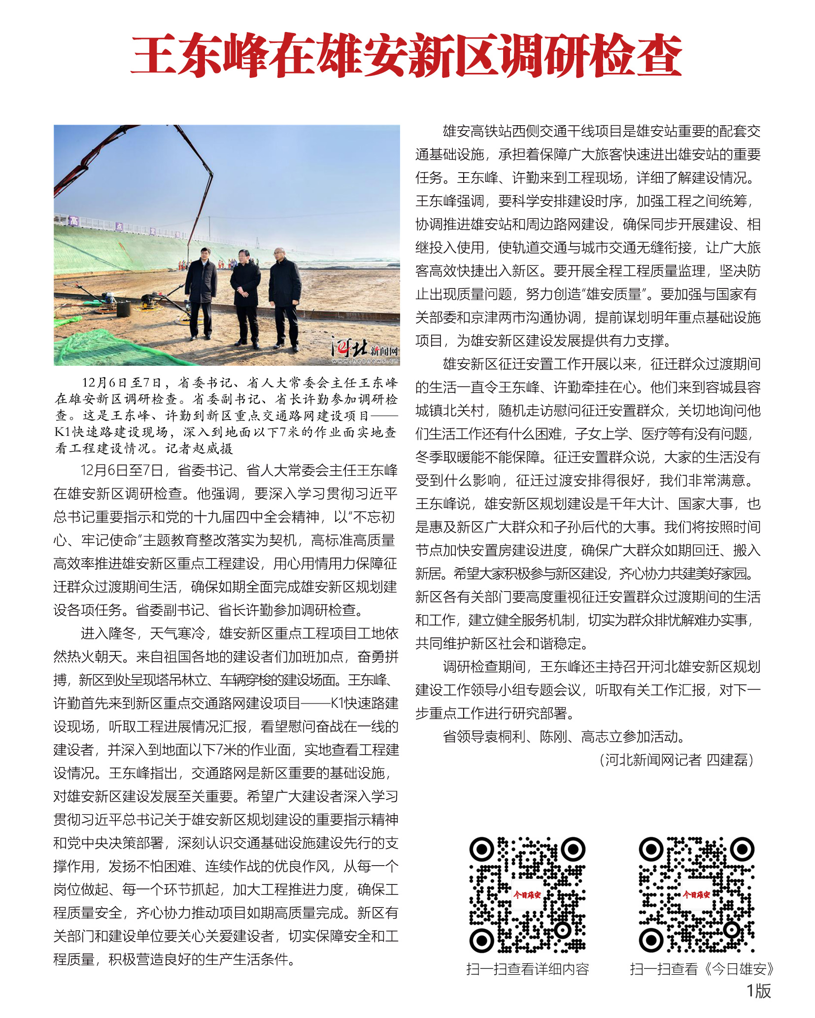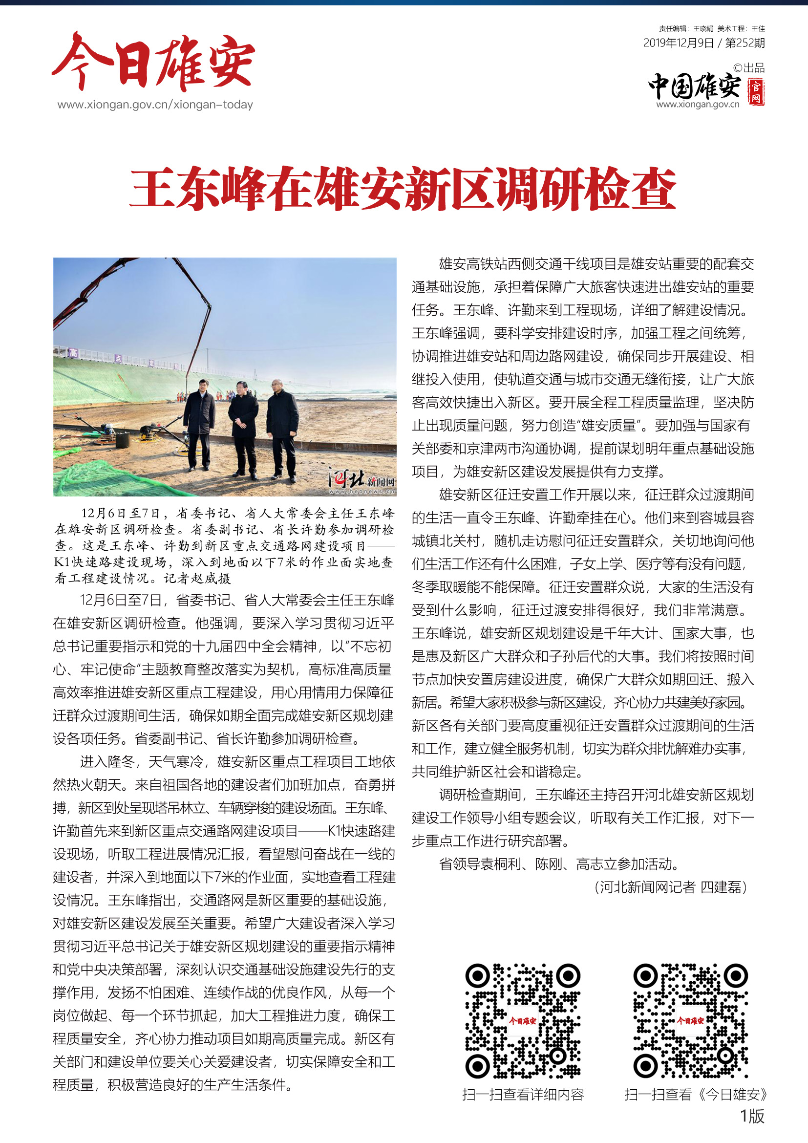 12月6日至7日,省委书记、省人大常委会主任王东峰在雄安新区调研检查。