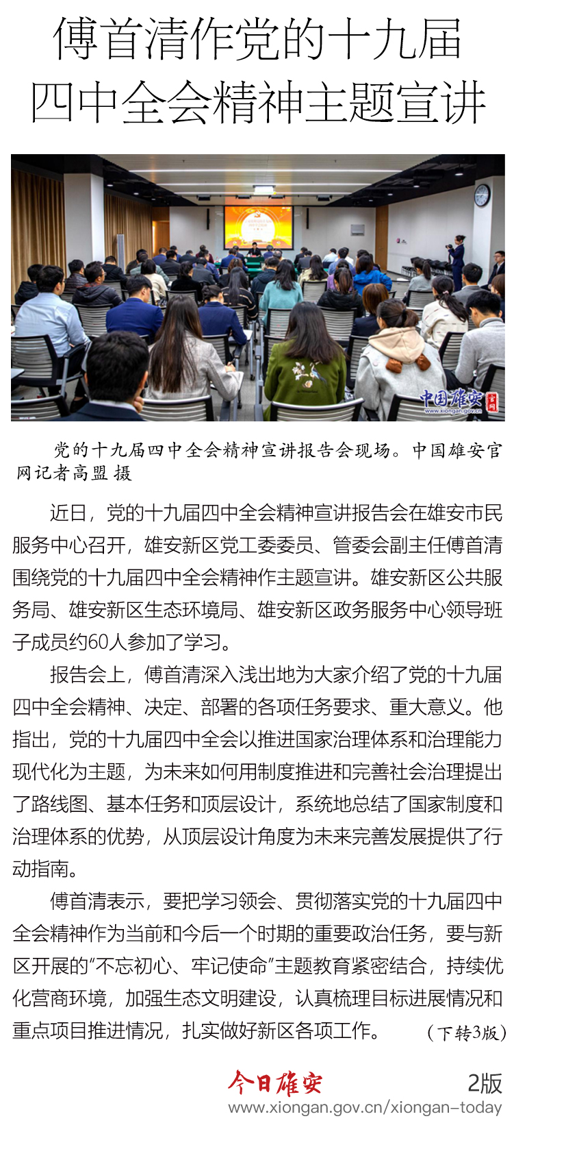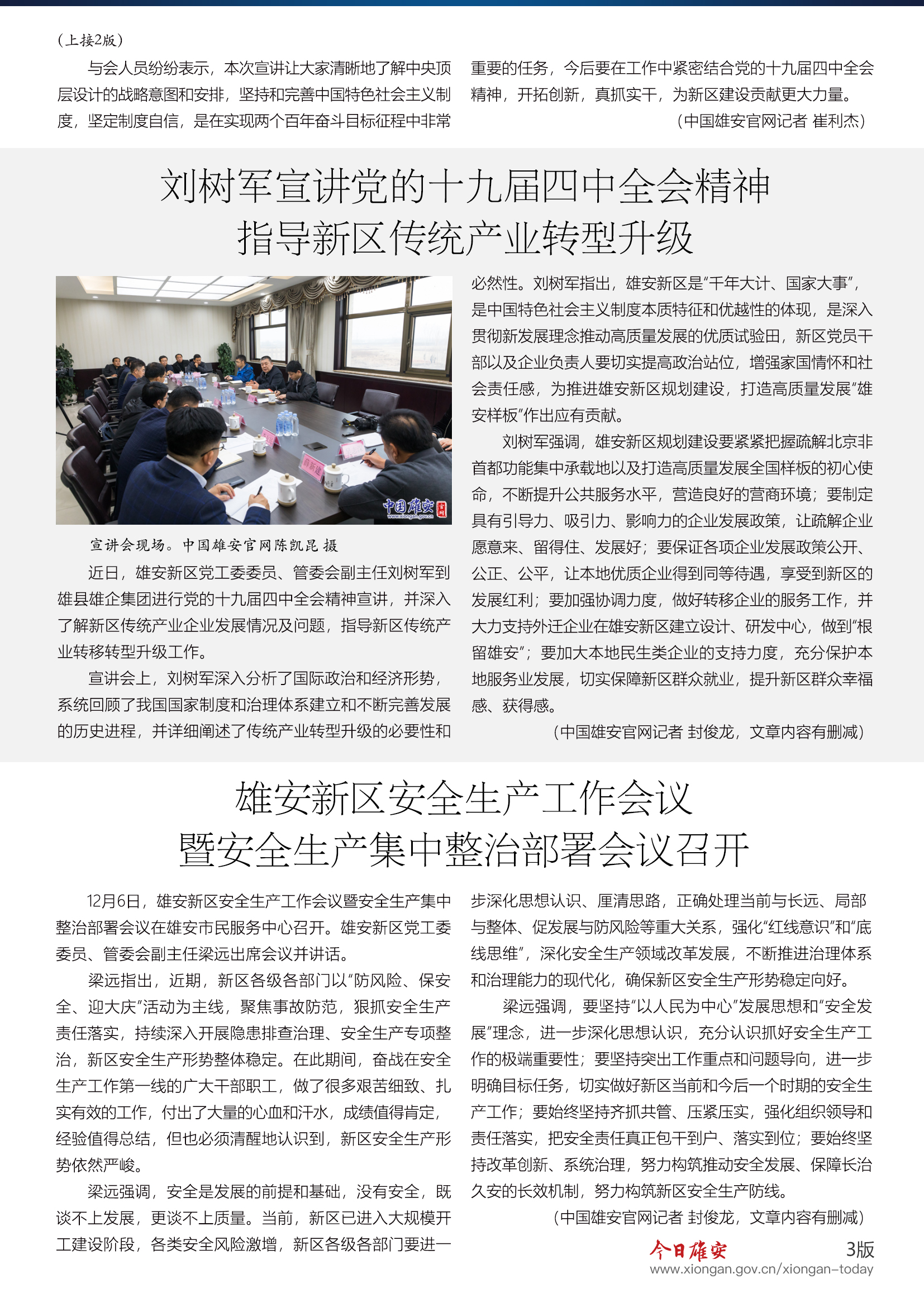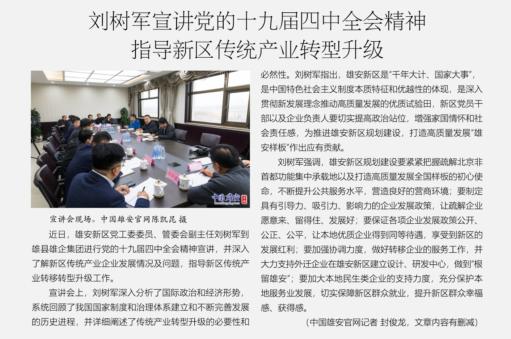 近日,雄安新区党工委委员、管委会副主任刘树军到雄县雄企集团进行党的十九届四中全会精神宣讲,并深入了解新区传统产业企业发展情况及问题,指导新区传统产业转移转型升级工作。