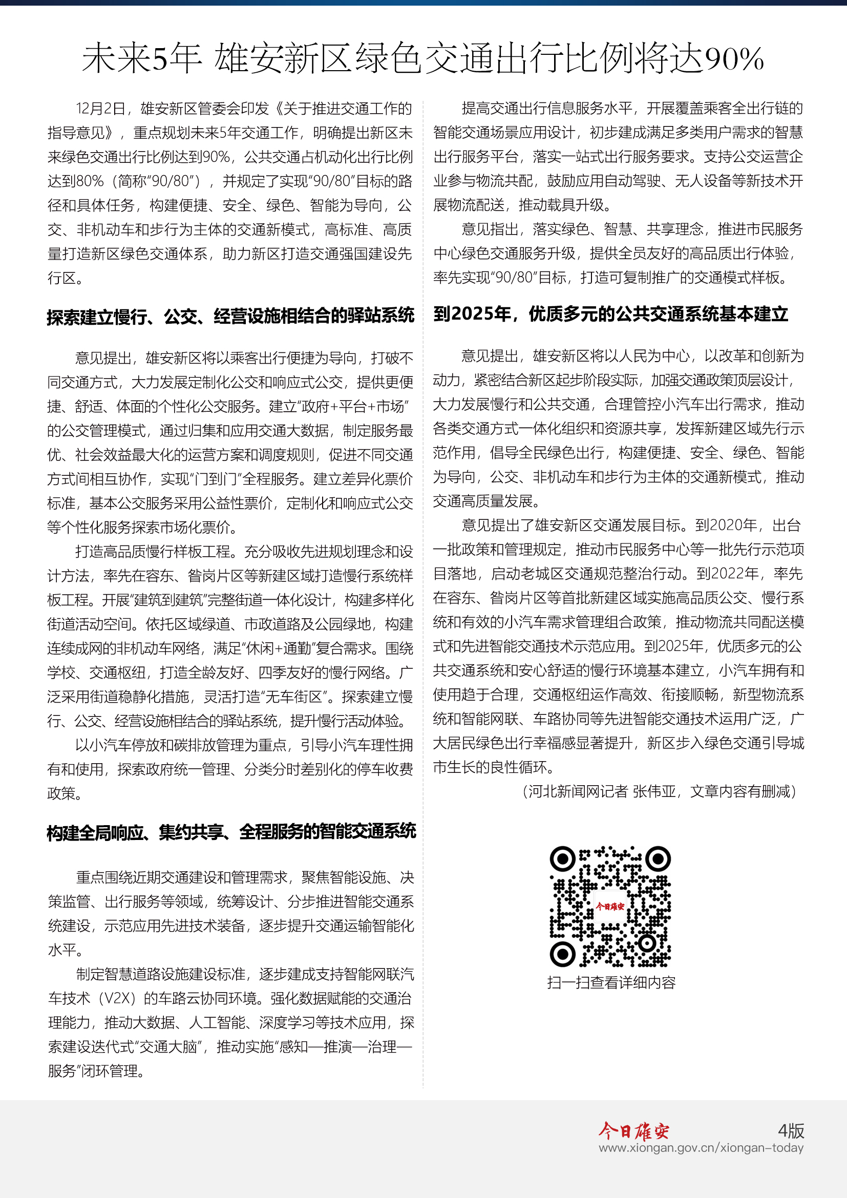12月2日,雄安新区管委会印发《关于推进交通工作的指导意见》,重点规划未来5年交通工作,明确提出新区未来绿色交通出行比例达到90%。