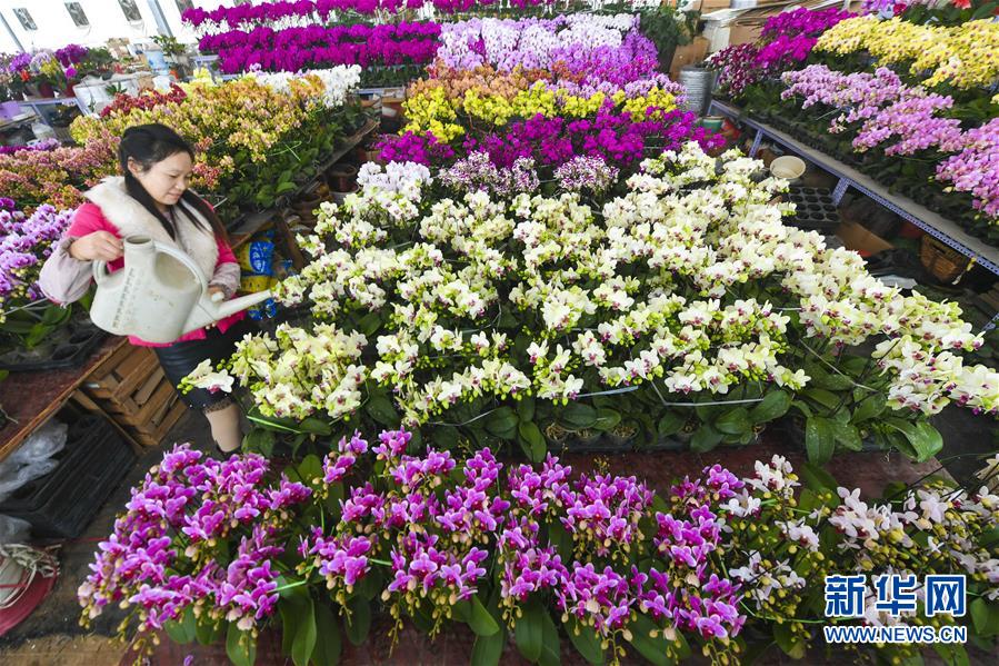 12月10日,在永清县恒美国际花都市场交易大厅内,花商在浇花。 新年将至,河北省永清县恒美国际花都鲜花市场迎来销售旺季。近年来,永清县发挥毗邻京津的区位优势,通过产业引导、搭建平台、政策扶持等举措,吸引近300家北京花商入驻。新华社记者李晓果 摄