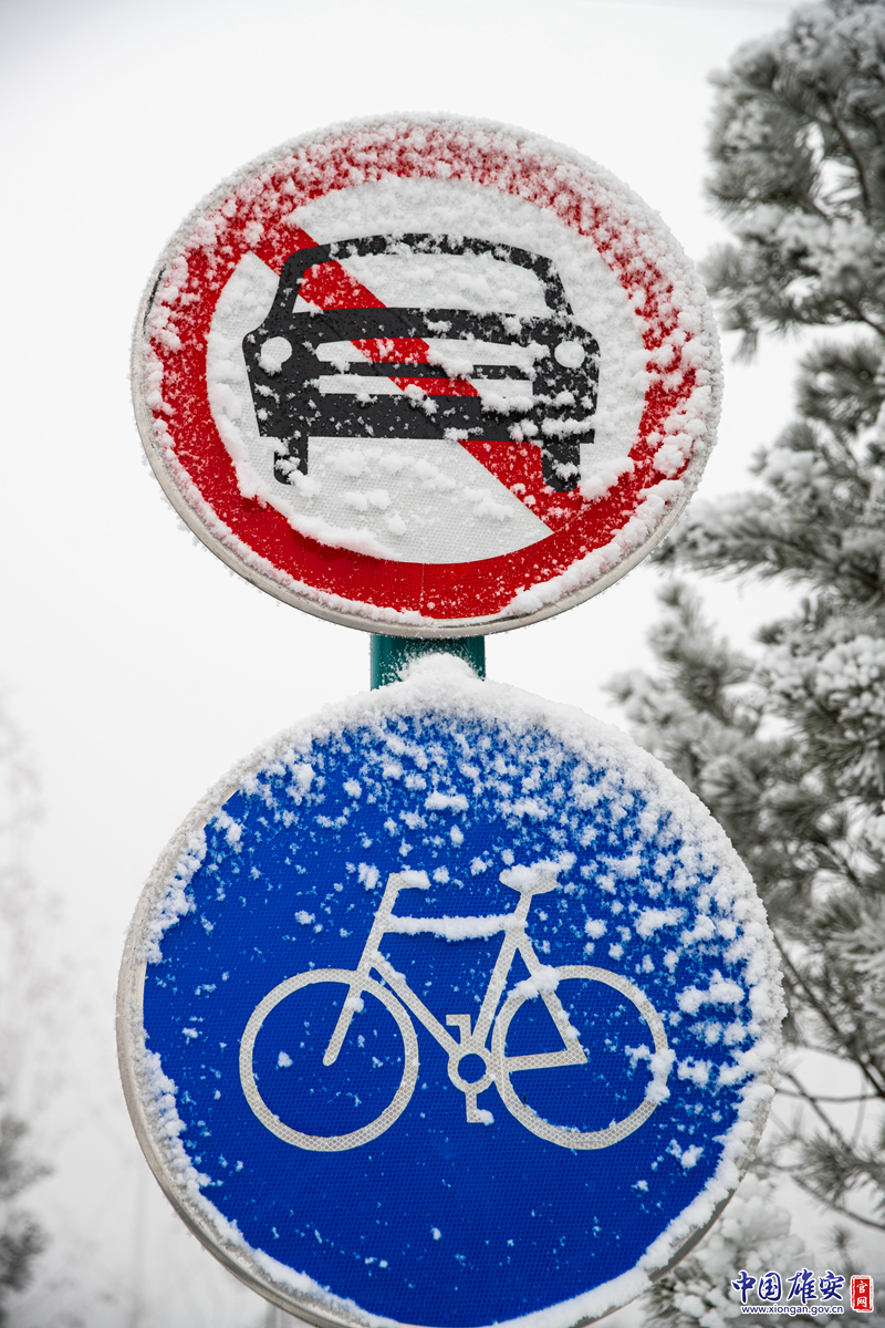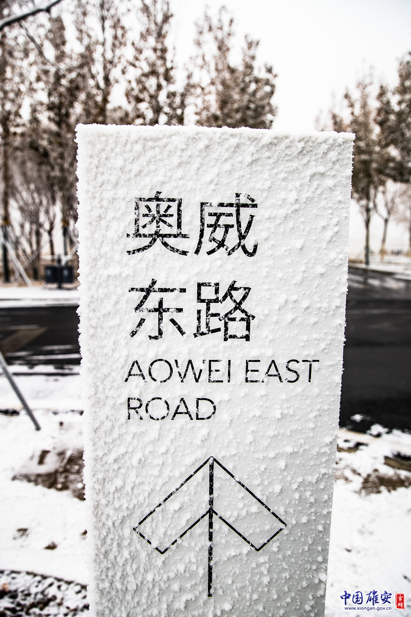 雄安新区容城县奥威东路指示牌上,雪花布满,别有一番风味。中国雄安官网高盟 摄
