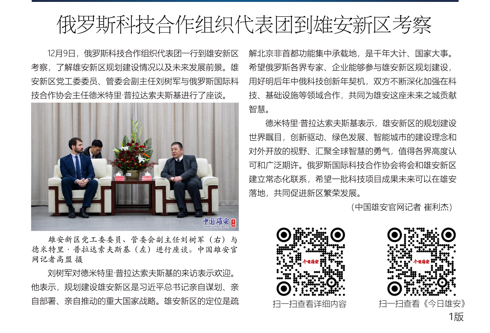 12月9日,俄罗斯科技合作组织代表团一行到雄安新区考察,了解雄安新区规划建设情况以及未来发展前景。