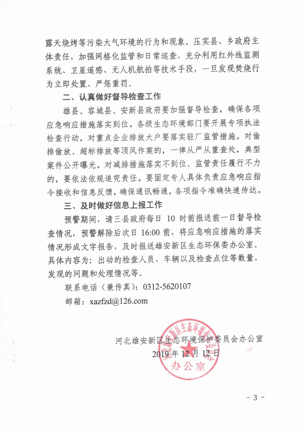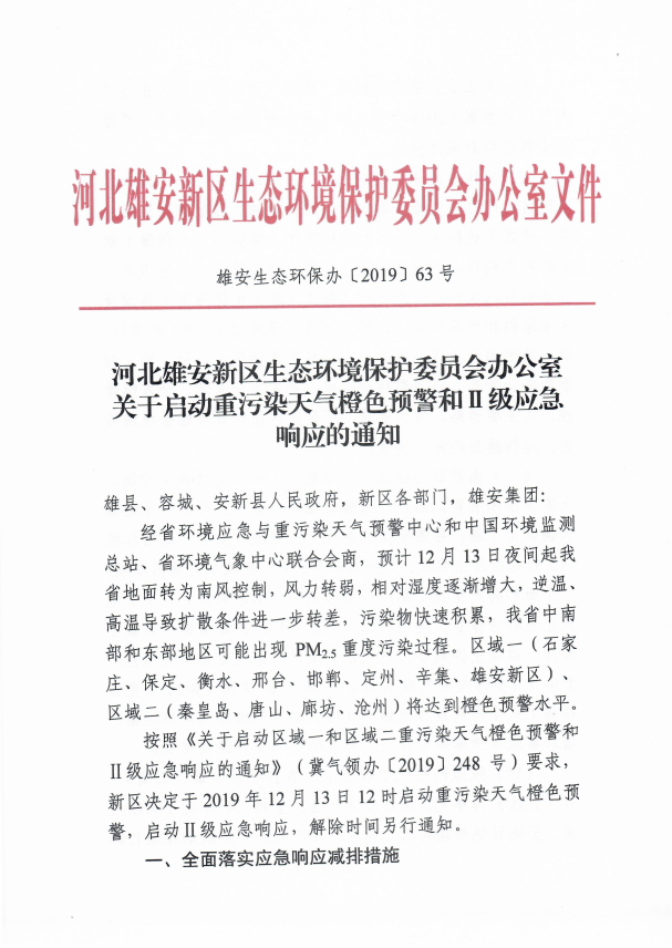 河北雄安新区生态环境保护委员会办公室关于启动重污染天气橙色预警和Ⅱ级应急响应的通知