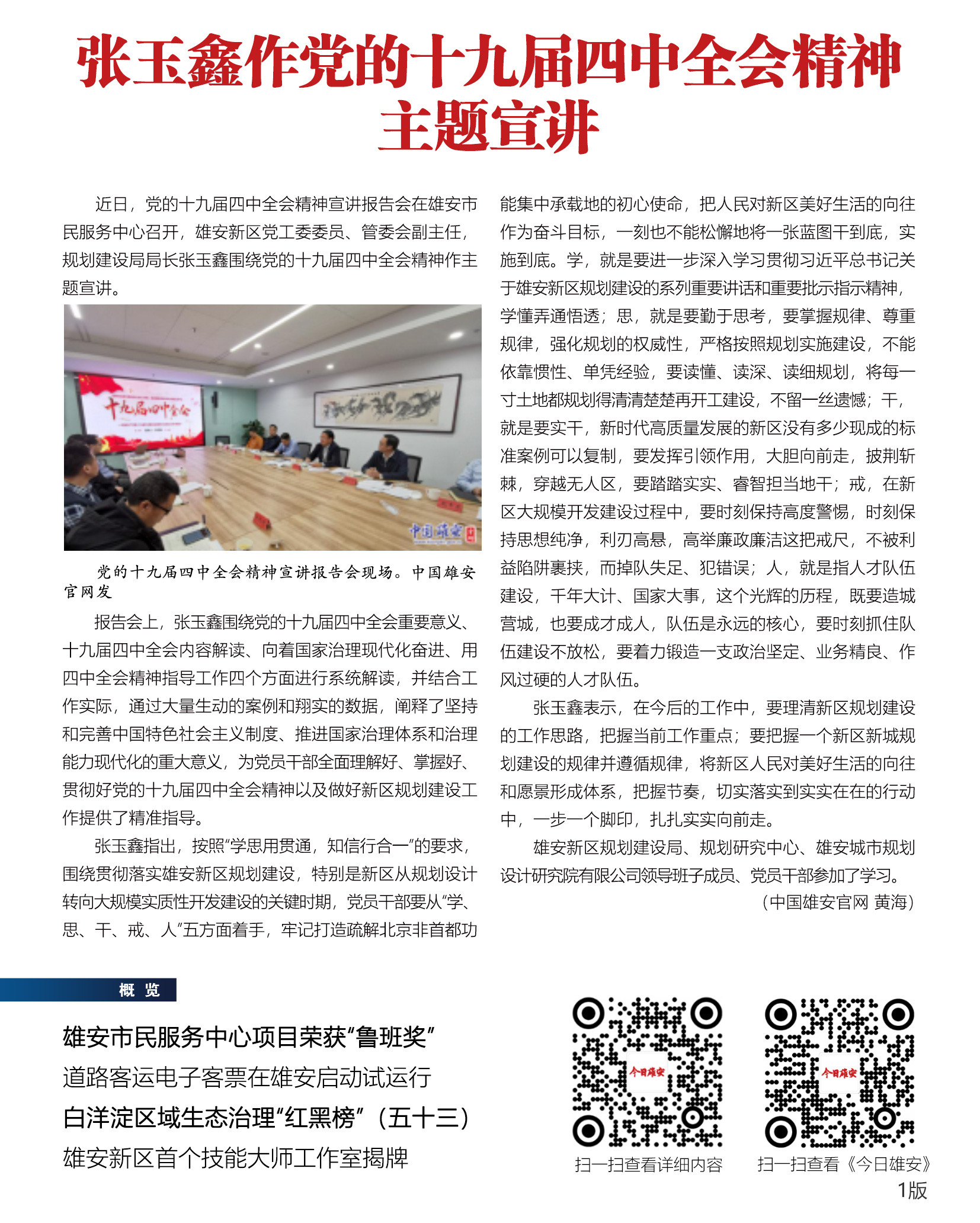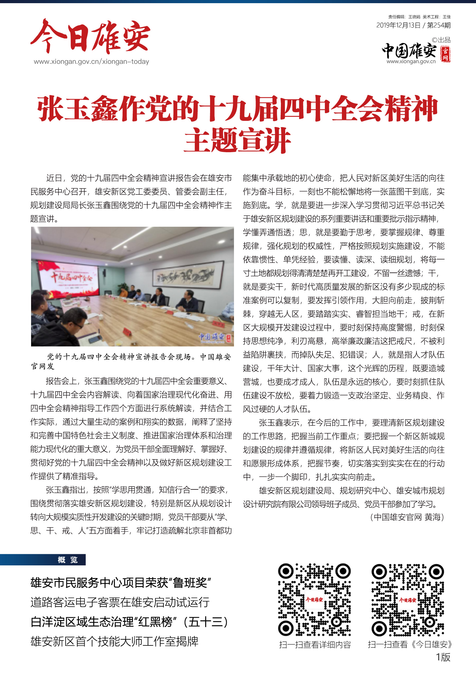 近日,党的十九届四中全会精神宣讲报告会在雄安市民服务中心召开,雄安新区党工委委员、管委会副主任,规划建设局局长张玉鑫围绕党的十九届四中全会精神作主题宣讲。