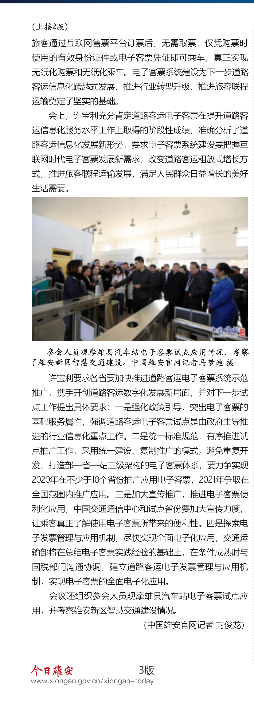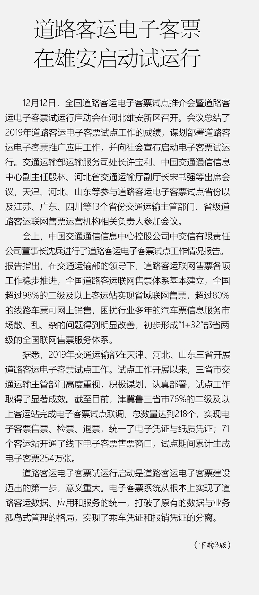 12月12日,全国道路客运电子客票试点推介会暨道路客运电子客票试运行启动会在河北雄安新区召开。
