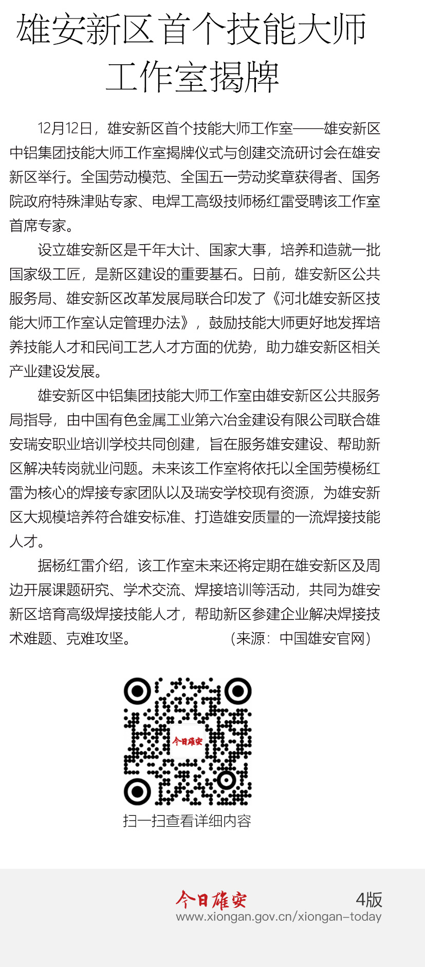 12月12日,雄安新区首个技能大师工作室——雄安新区中铝集团技能大师工作室揭牌仪式与创建交流研讨会在雄安新区举行。