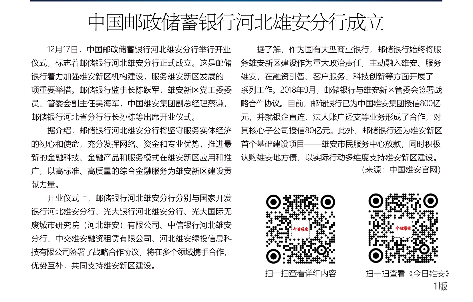 12月17日,中国邮政储蓄银行河北雄安分行举行开业仪式,标志着邮储银行河北雄安分行正式成立。