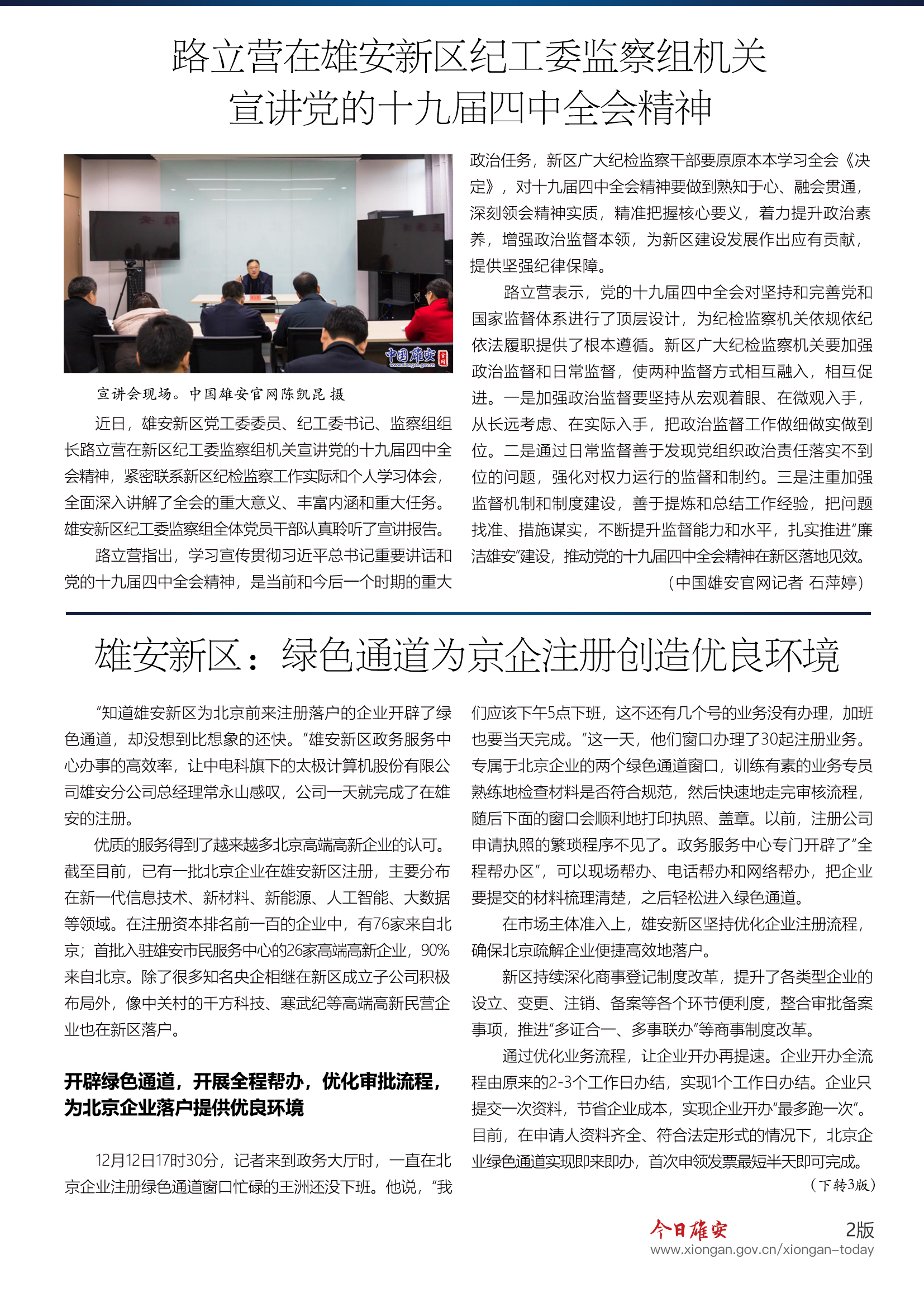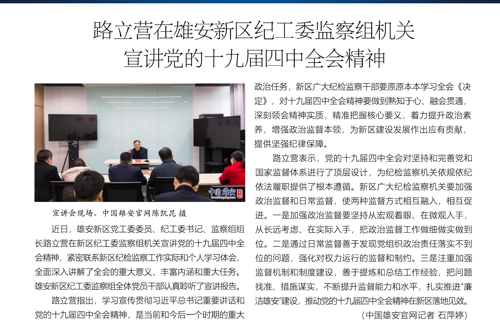路立营在雄安新区纪工委监察组机关宣讲党的十九届四中全会精神