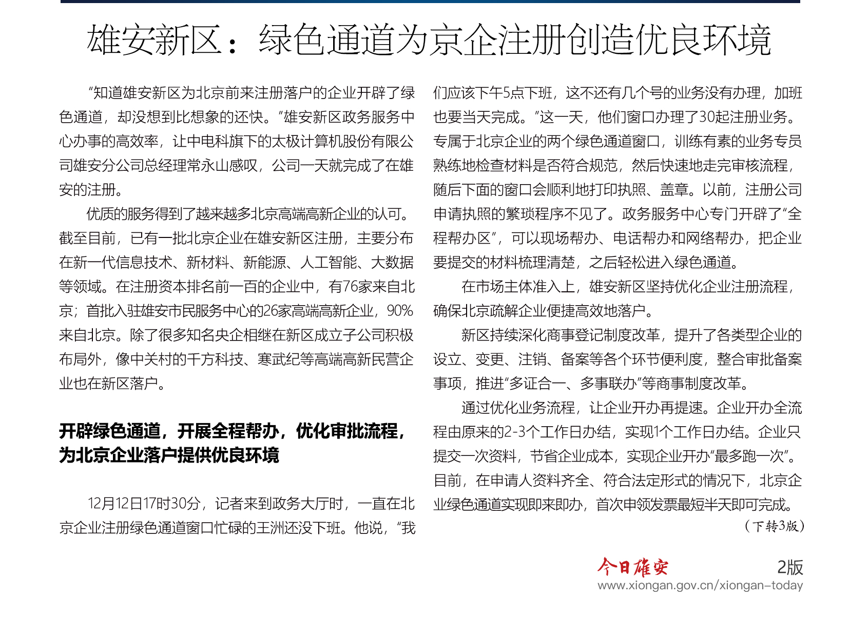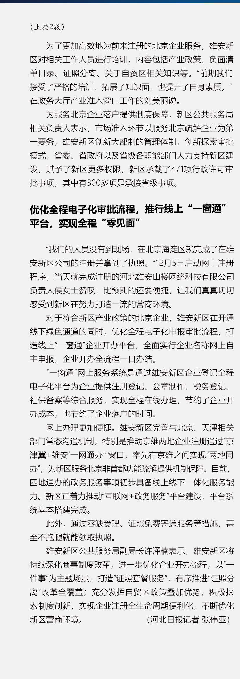 雄安新区将持续深化商事制度改革,进一步优化企业开办流程,以“一件事”为主题场景,打造“证照套餐服务”,有序推进“证照分离”改革全覆盖。