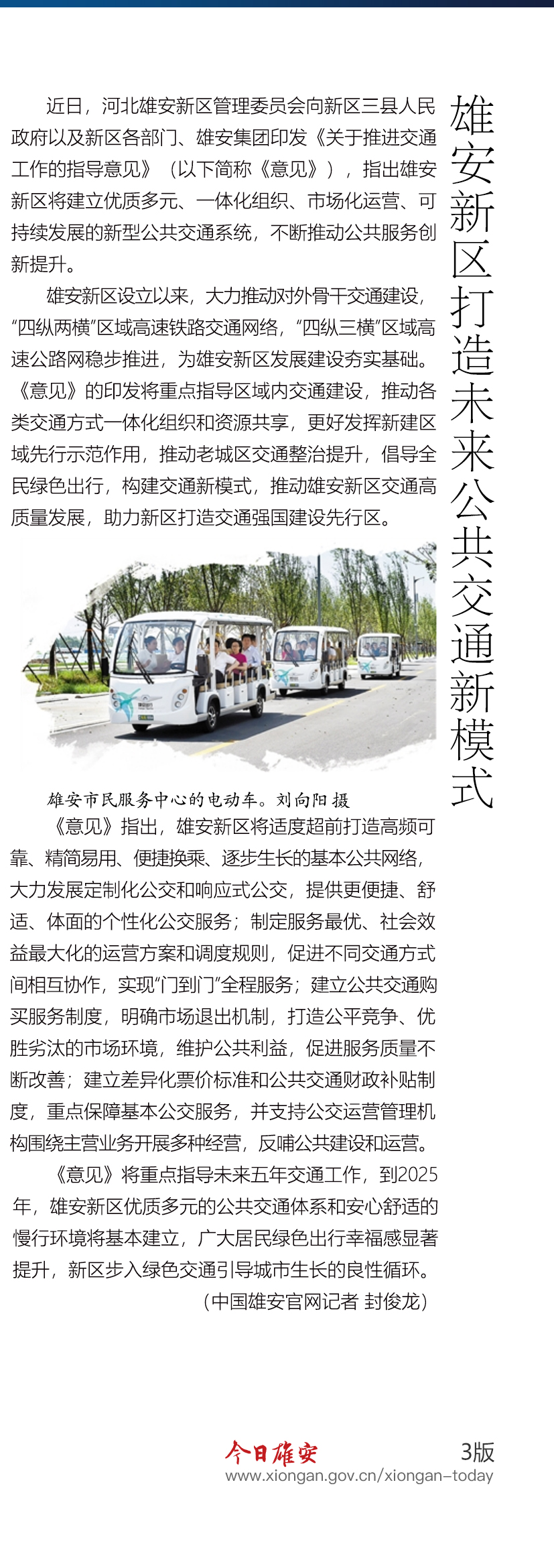 雄安新区将建立优质多元、一体化组织、市场化运营、可持续发展的新型公共交通系统,不断推动公共服务创新提升。