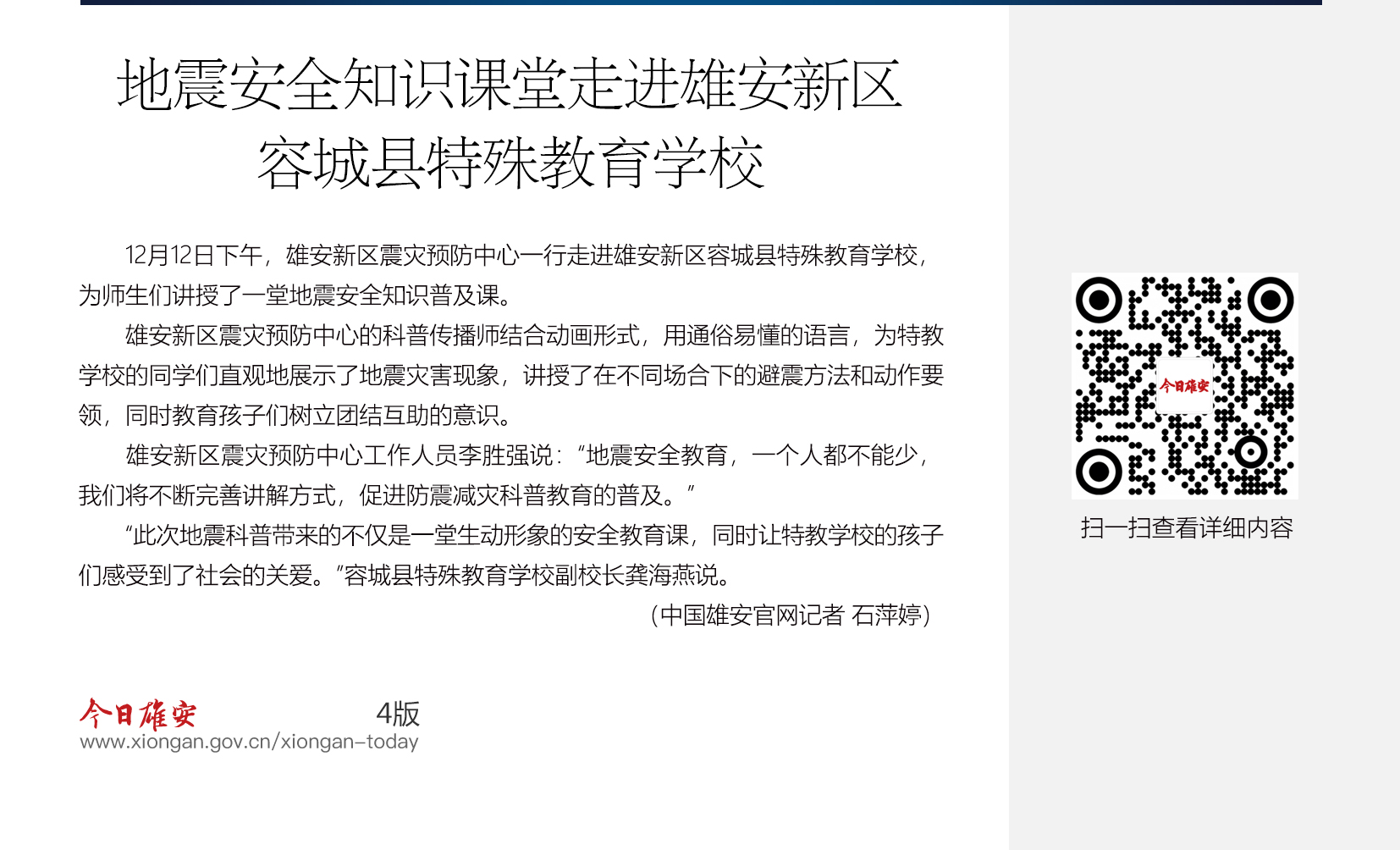 12月12日下午,雄安新区震灾预防中心一行走进雄安新区容城县特殊教育学校,为师生们讲授了一堂地震安全知识普及课。