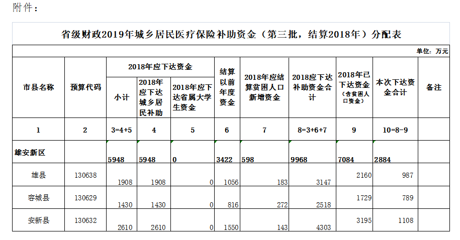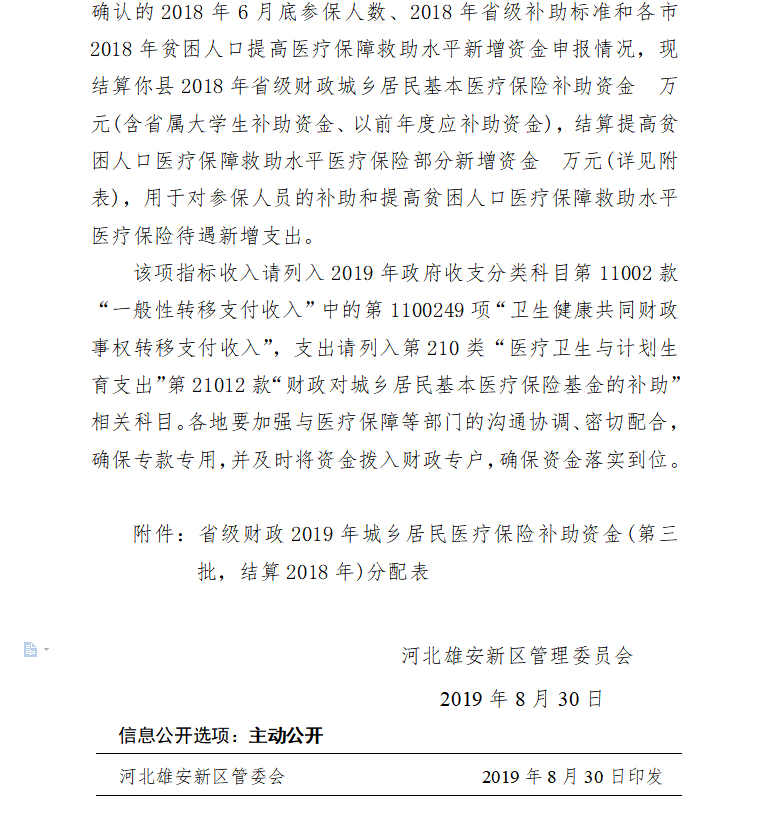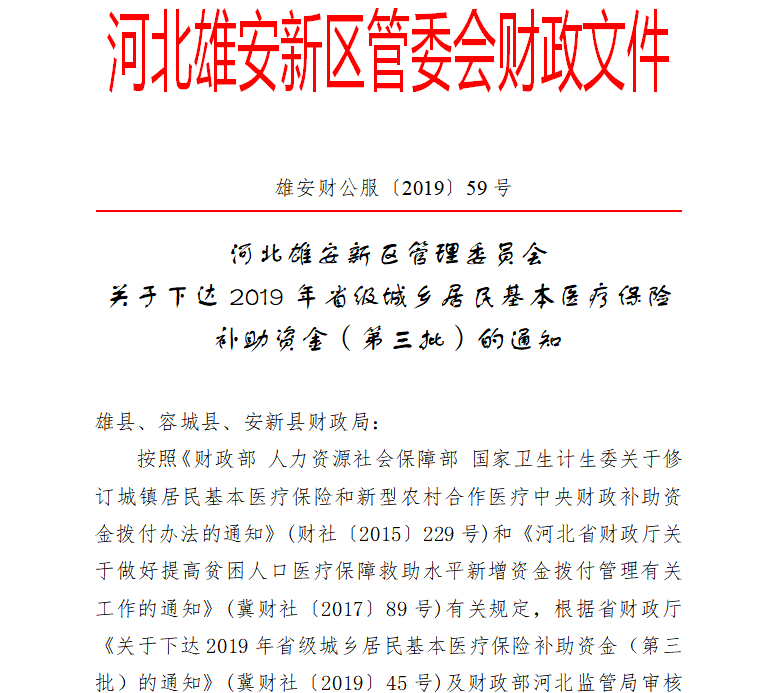 现将雄安新区下达2019年省级城乡居民基本医疗保险补助资金(第三批)资金分配结果予以公告,如有异议,请向以下部门提出意见。