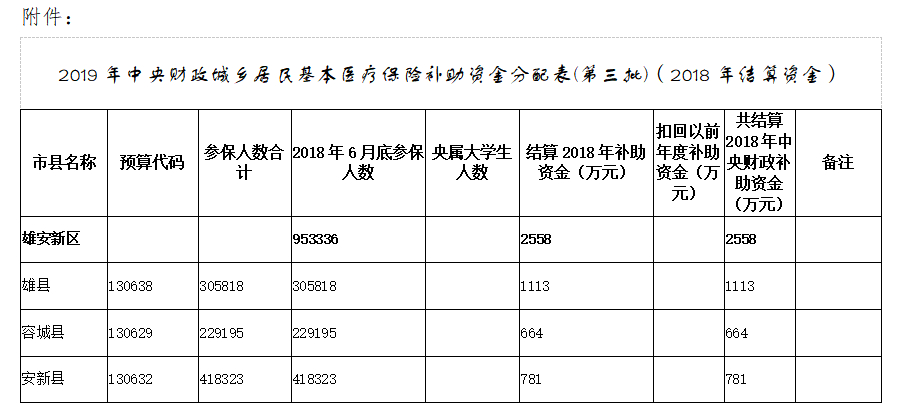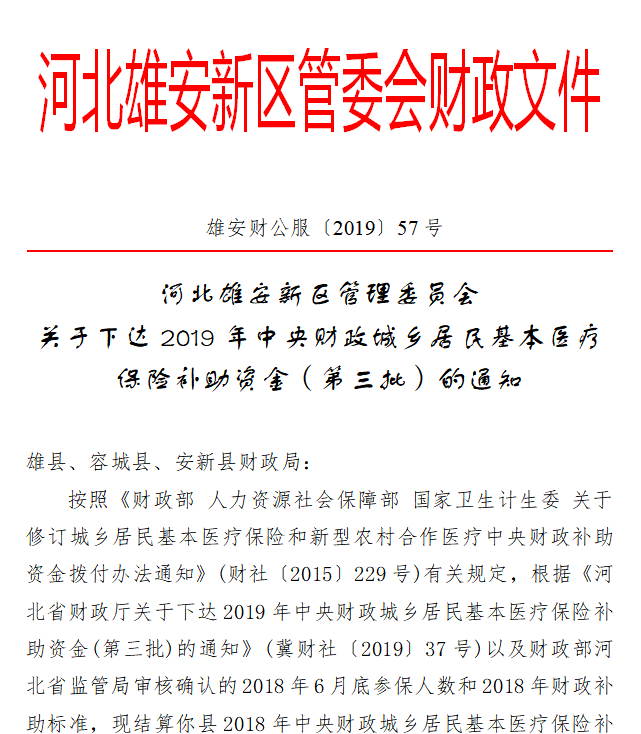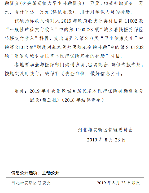 现将雄安新区下达2019年中央财政城乡居民基本医疗保险补助资金(第三批)资金分配结果予以公告,如有异议,请向以下部门提出意见。