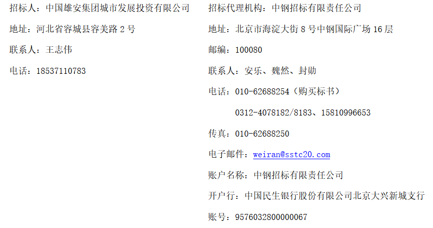 4.1时间期限:请于2019年12月26日至2019年12月30日,每天9:00-12:00、13:00-17:00(北京时间、节假日除外)。地点:中钢招标有限责任公司(北京市海淀大街8号中钢国际广场16层)。获取方式及售价:招标文件每标段人民币200元(售后不退),可现场购买或邮购,若邮购,须加付快递费人民币100元。投标人购买招标文件时须同时提供:(1)购买人个人有效身份证件复印件;(2)“雄安新区公共资源交易服务平台”网上报名成功的网页截图;(3)联合体协议书原件(邮购须随邮件发送扫描件),联合体投标人提供;(4)《投标人联系信息表》签字件(同时发送word格式电子版至指定邮箱),以便及时通知有关项目信息;(5)《投标人开票信息表》(附件2)盖章件(同时发送word格式电子版至指定邮箱),以便开具发票;(在“雄安新区公共资源交易服务平台”网上报名成功后,在招标文件下载处可下载附件)(6)当以汇款方式邮购的,须将标书款及邮资的汇款单复印件(须使用对公账户)发至指定邮箱,汇款单附言处须注明本项目招标编号/标段号。指定邮箱为anle@sstc20.com。