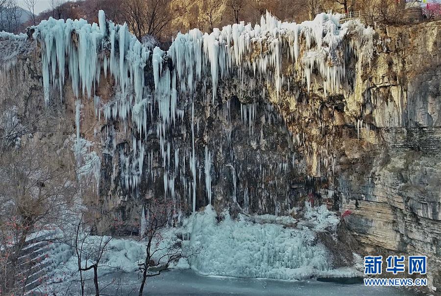 这是平山县沕沕水景区的冰瀑(12月25日无人机摄)。近日,河北省平山县境内的沕沕水景区出现冰瀑美景,形态各异的冰柱悬挂在山麓间,吸引游客前来观赏。新华社记者杨世尧 摄