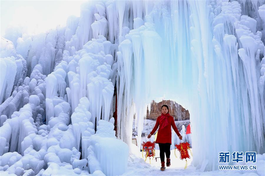 12月25日,一名游客在平山县沕沕水景区游览。近日,河北省平山县境内的沕沕水景区出现冰瀑美景,形态各异的冰柱悬挂在山麓间,吸引游客前来观赏。新华社记者杨世尧 摄