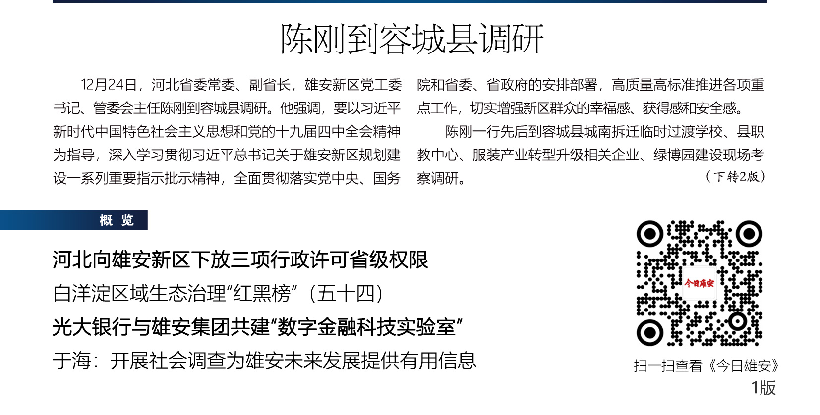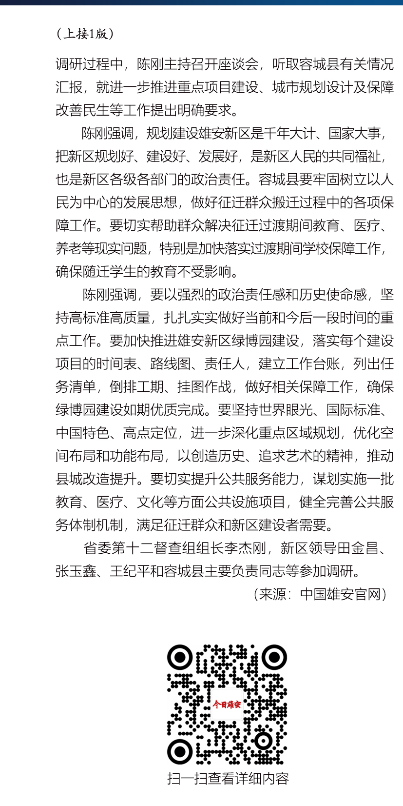 12月24日,河北省委常委、副省长,雄安新区党工委书记、管委会主任陈刚到容城县调研。