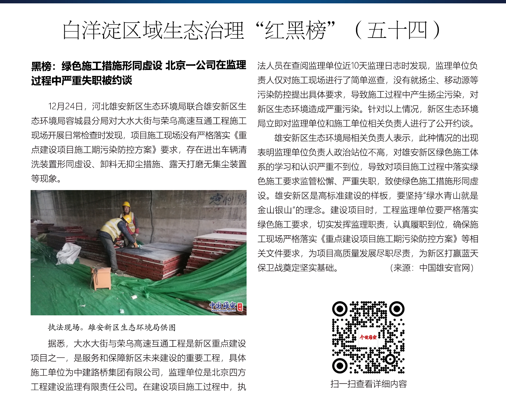 12月24日,雄安新区生态环境局联合雄安新区生态环境局容城县分局对大水大街与荣乌高速互通工程施工现场开展检查时发现,施工现场存在卸料无抑尘措施、露天打磨无集尘装置等现象。