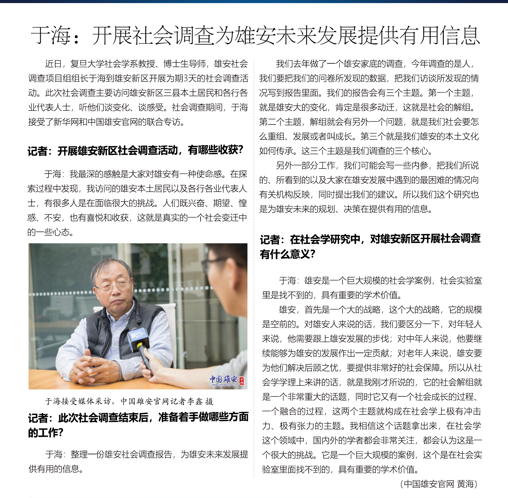 于海:开展社会调查为雄安未来发展提供有用信息