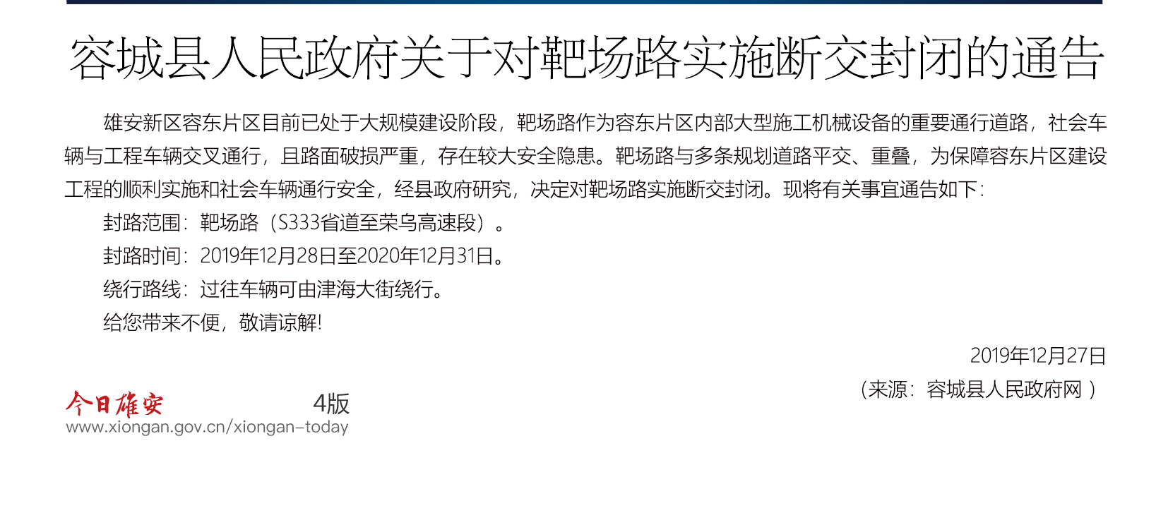 容城县人民政府关于对靶场路实施断交封闭的通告