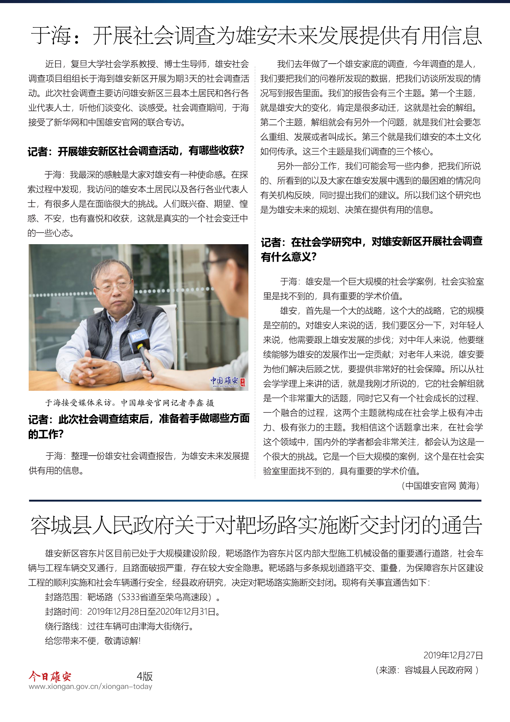 近日,复旦大学社会学系教授、博士生导师,雄安社会调查项目组组长于海到雄安新区开展为期3天的社会调查活动。