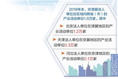2018年末,京津冀法人单位在区域内跨省(市)的产业活动单位1.6万家。其中,北京法人单位在津冀地区的产业活动单位1.2万家,天津法人单位在京冀地区的产业活动单位0.3万家,河北法人单位在京津地区的产业活动单位0.1万家。