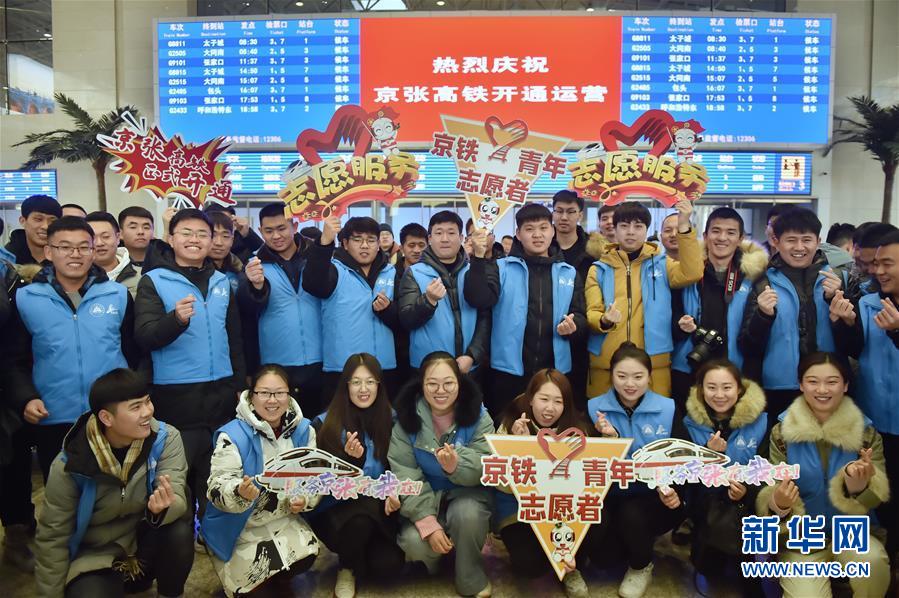 12月30日,青年志愿者在北京北站候车室合影留念。当日,北京至张家口高速铁路开通运营,崇礼铁路同步通车。新华社发(彭子洋 摄)