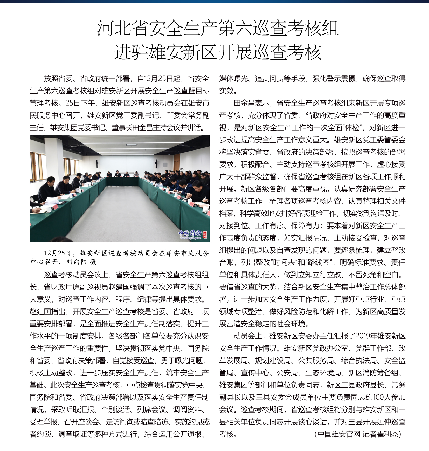 按照省委、省政府统一部署,自12月25日起,省安全生产第六巡查考核组对雄安新区开展安全生产巡查暨目标管理考核。