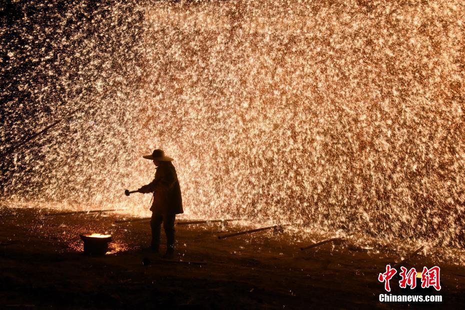 1月1日晚,河北省张家口市蔚县涌泉庄举行传统特色打“树花”民俗文化活动,迎接新年到来。中新社记者孙自法 摄