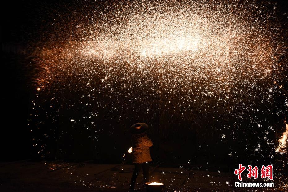 打树花是用熔化的铁水泼洒迸溅形成万朵火花,因犹如枝繁叶茂的树冠而称之为“树花”。中新社记者孙自法 摄