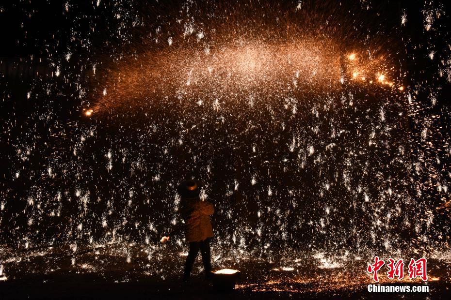 1月1日晚,河北省张家口市蔚县涌泉庄举行传统特色打“树花”民俗文化活动,迎接新年到来。中新社记者孙自法 摄