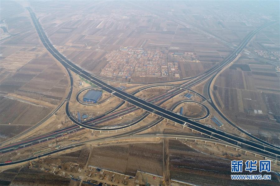 这是1月3日拍摄的北京大兴国际机场北线高速公路廊坊段王场互通枢纽(无人机照片)。