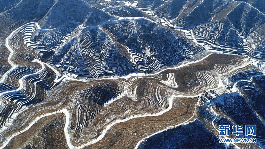 2018年1月8日拍摄的后池村梯田雪景(无人机照片)。新华社记者 王晓 摄