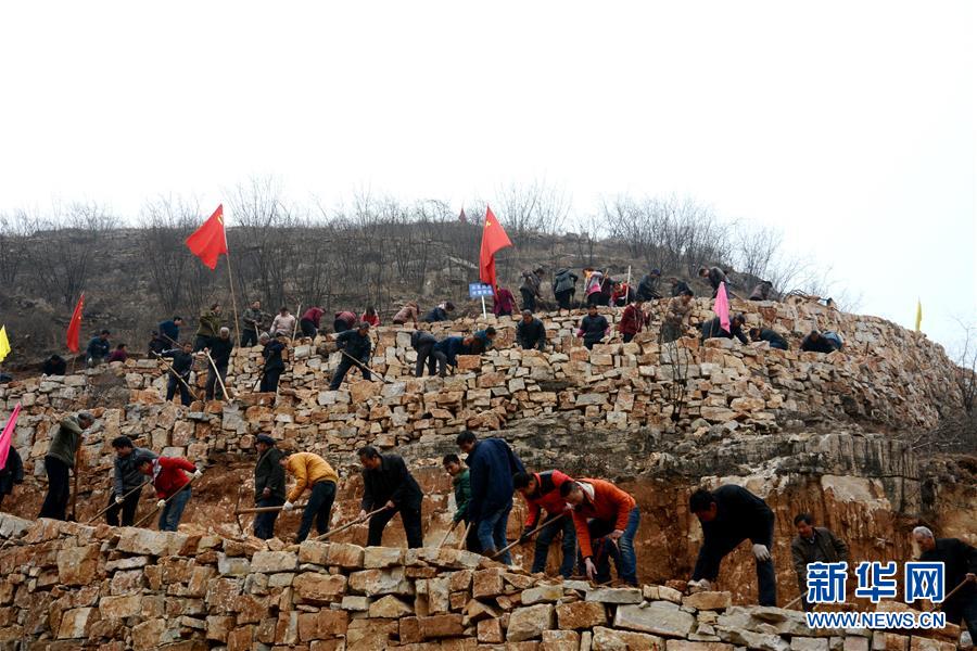 2016年3月4日,后池村村民在传运修路用的石头。新华社记者 范世辉 摄