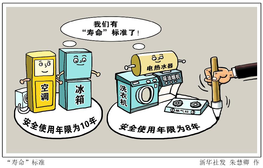 新华社北京1月10日电(记者姜琳)10日,由中国家用电器协会组织行业制定的“家用电器安全使用年限”系列标准发布,确定了冰箱、空调的安全使用年限为10年,洗衣机及干衣机、吸油烟机、燃气灶、电热水器的安全使用年限为8年。我国主要家电首次有了专业的“寿命”标准。