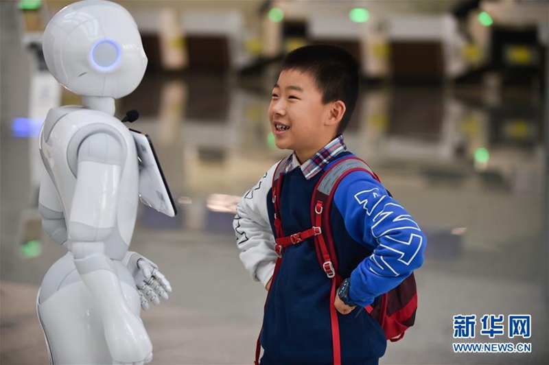 1月10日,在北京大兴国际机场,一名小旅客在和智能机器人对话。新华社发(彭子洋摄)