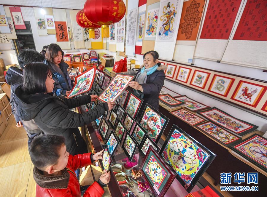 1月12日,顾客在河北省武强县的一家年画销售点选购武强木版年画产品。随着春节的临近,武强木版年画进入销售旺季,年画作坊内一片繁忙景象,年画艺人忙着制作、销售年画,保证年画市场的供应量。2006年,武强木版年画入选第一批国家级非物质文化遗产保护名录。新华社记者 李晓果 摄