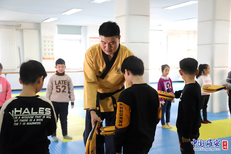 “我与雄安共成长”征迁群众子女冬令营活动中,跆拳道老师在指导武术动作。安新县征迁办供图