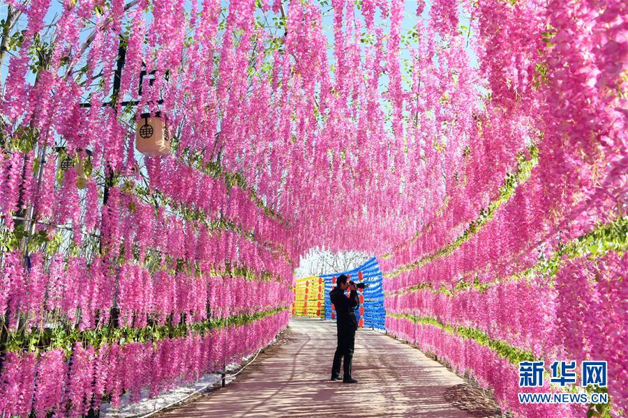 1月13日,在蓟州区穿芳峪镇小穿芳峪村,游客在用人造花布置的迎春走廊内拍照。春节临近,有“天津后花园”之称的天津市蓟州区着力打造以冰雪、节庆为主题的文化旅游活动,吸引各地游客前来体验。新华社记者 马平 摄