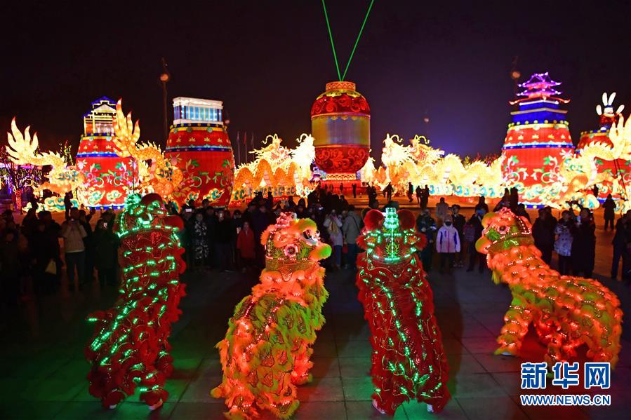 1月17日,游客在2020唐山南湖春节灯会现场观看舞狮表演。当日,2020唐山南湖春节灯会在河北省唐山市南湖景区开幕,缤纷的花灯和特色浓郁的非遗展演吸引大批市民和游客前来欣赏。新华社记者 牟宇 摄