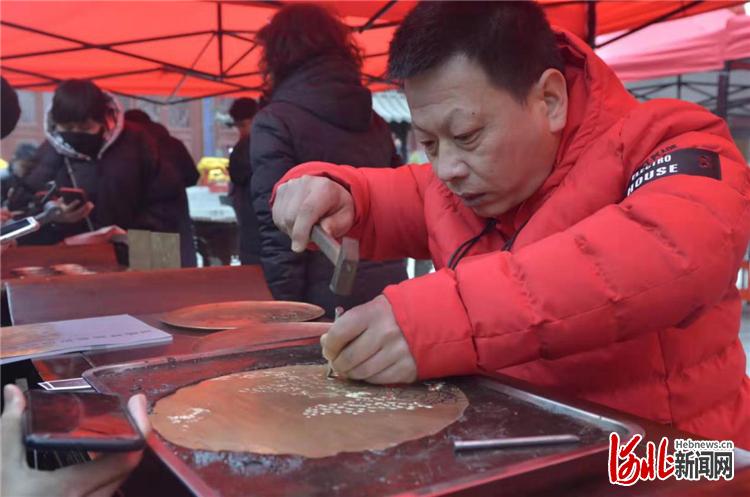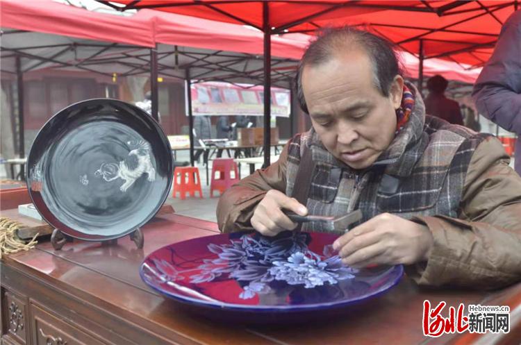 在展演现场,非遗师傅们的现场创作吸引了众人的围观。“敲上1亿次,这个牡丹就快成了!”刻瓷技艺的师傅候汉鹏说道,河间刻瓷技艺,是一种用剥凿刻釉的方法,在瓷盘一类瓷制器皿上雕刻人物、花鸟、文字等,再辅以托座、镶嵌等木雕工艺,形成一种独特的民间手工艺术。小小的磁盘,是他播种的原野,灵巧的刻刀,是他耕耘的犁杖,2017年,侯汉鹏的刻瓷技艺被评选为市级非物质文化遗产,这是对他艺术事业的又一次认可。“我争取让更多的人了解刻瓷、学习刻瓷,要将这门艺术发扬光大。”候汉鹏说。