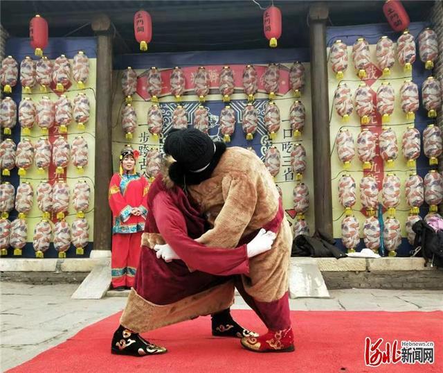 土门关驿道小镇特色春节文化节目二鬼摔跤表演。记者杜正杨摄