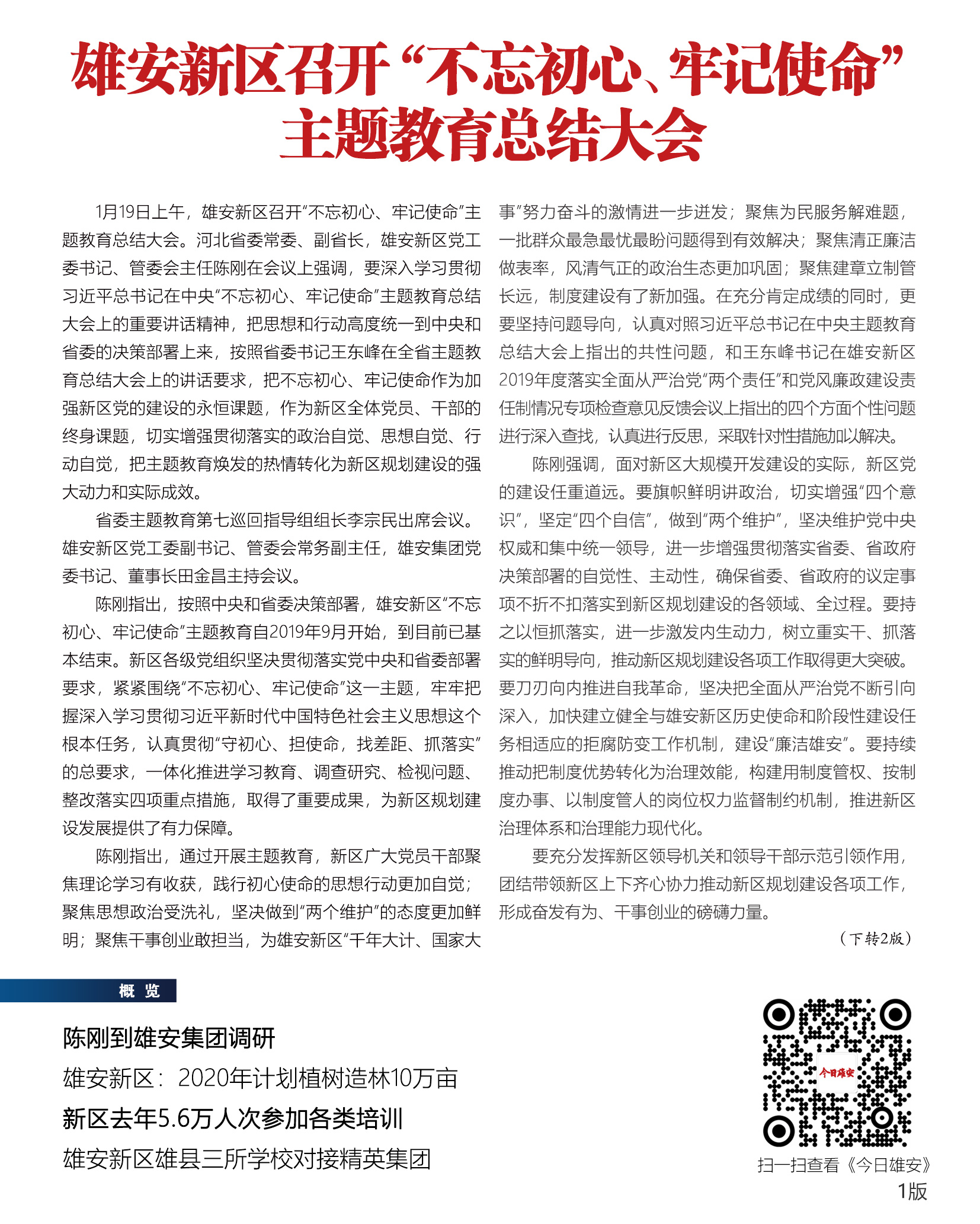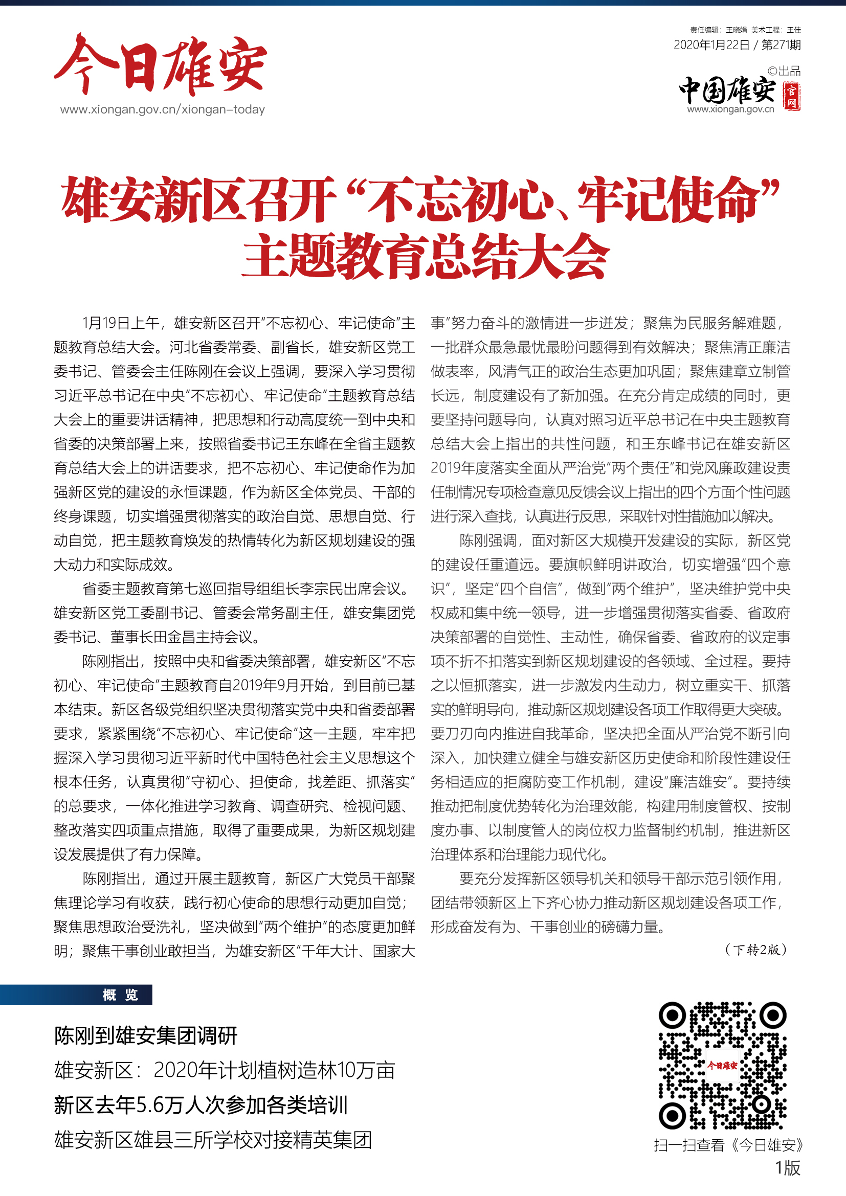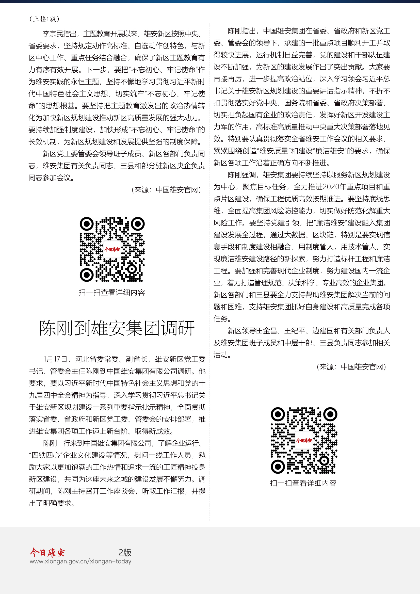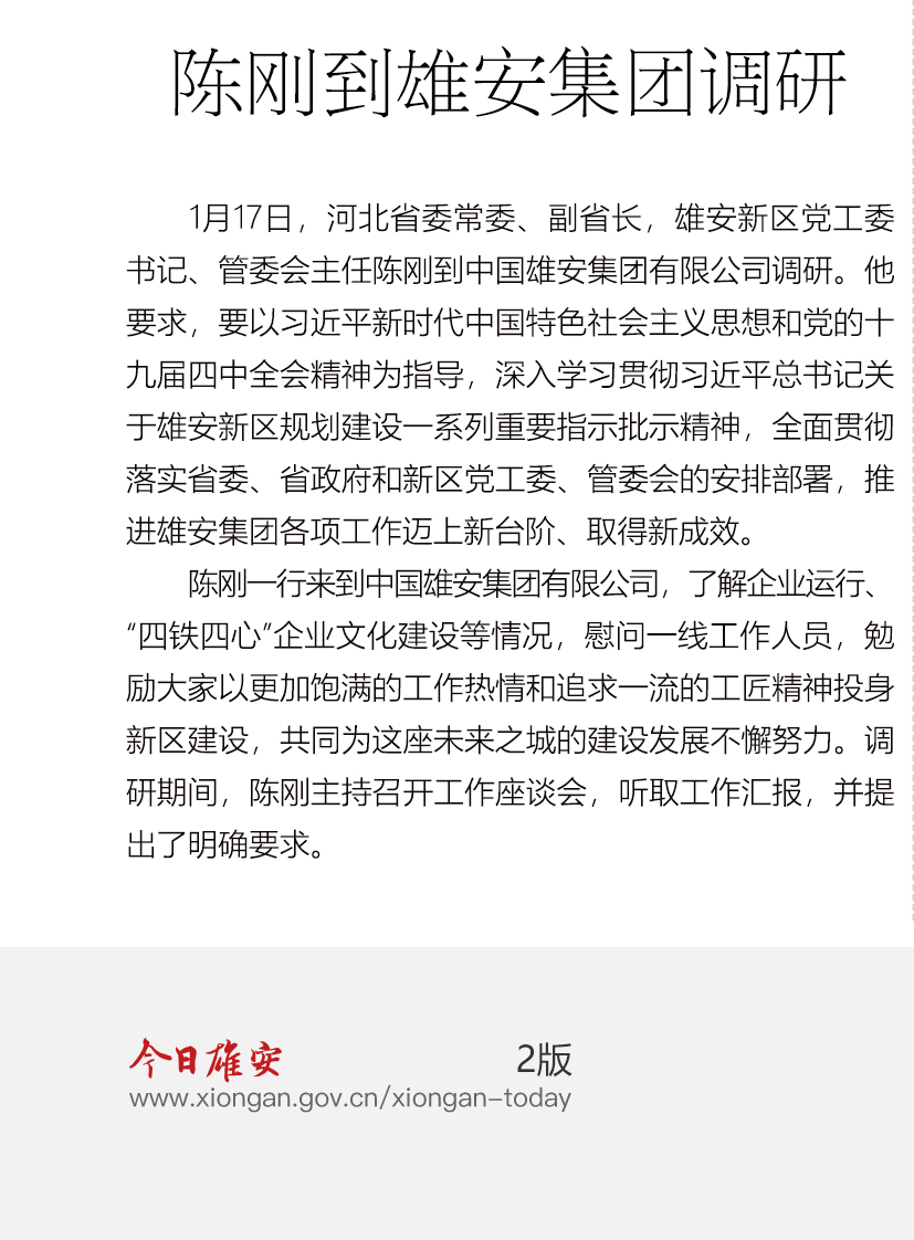 1月17日,省委常委、副省长,雄安新区党工委书记、管委会主任陈刚到中国雄安集团有限公司调研。