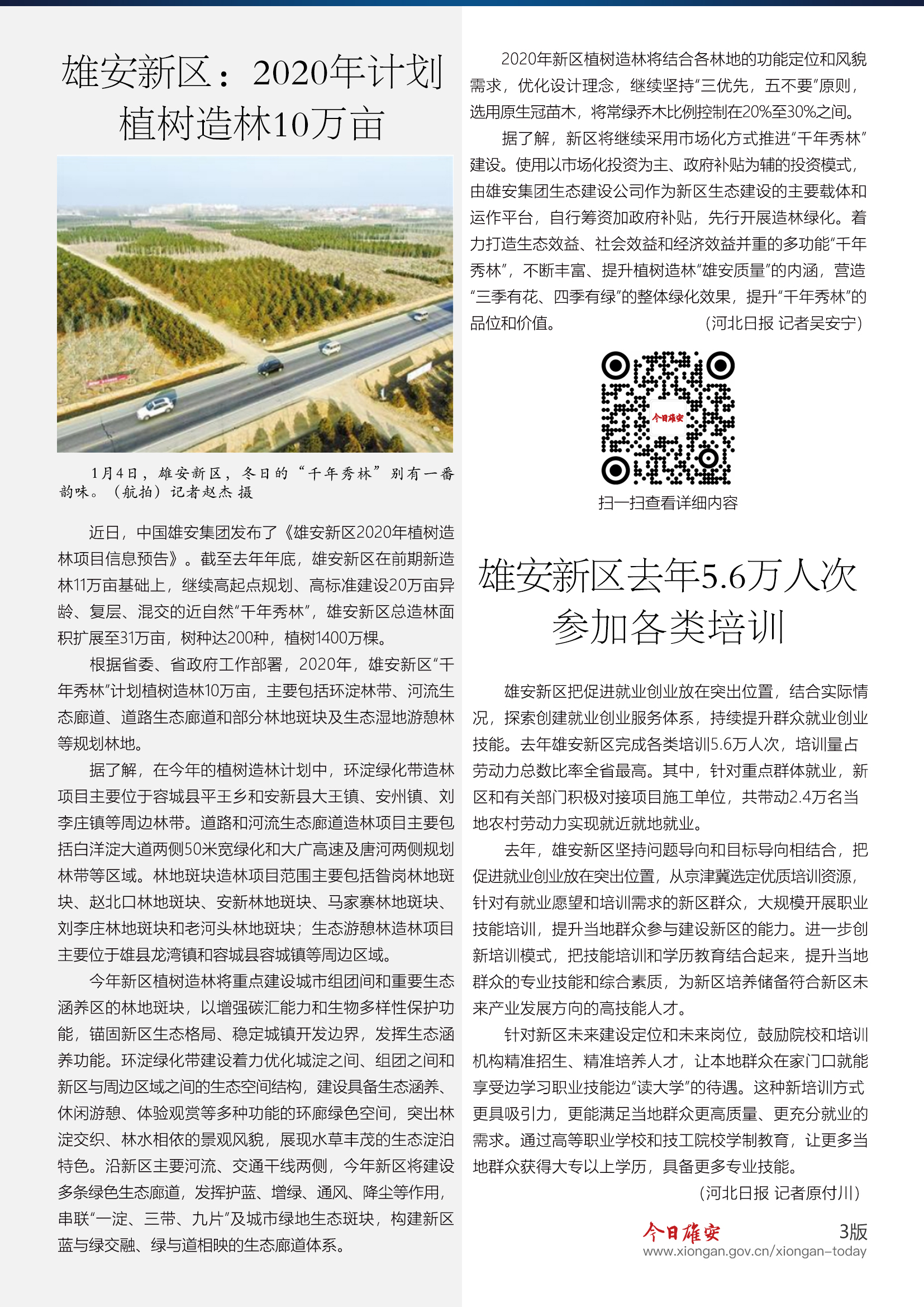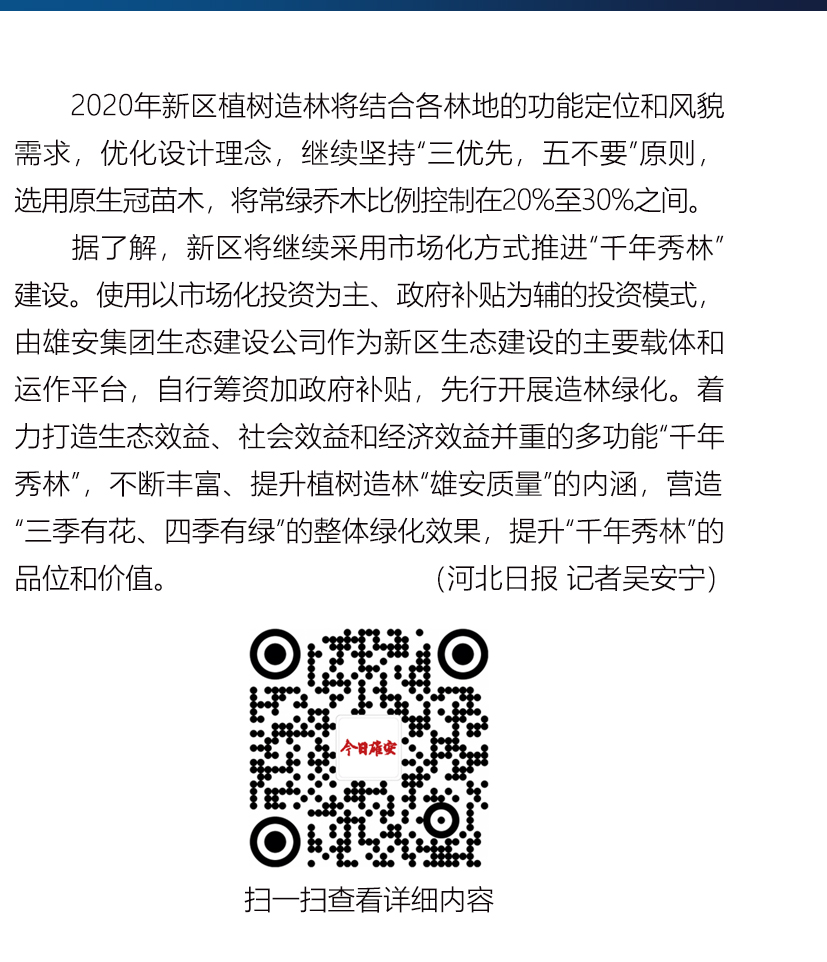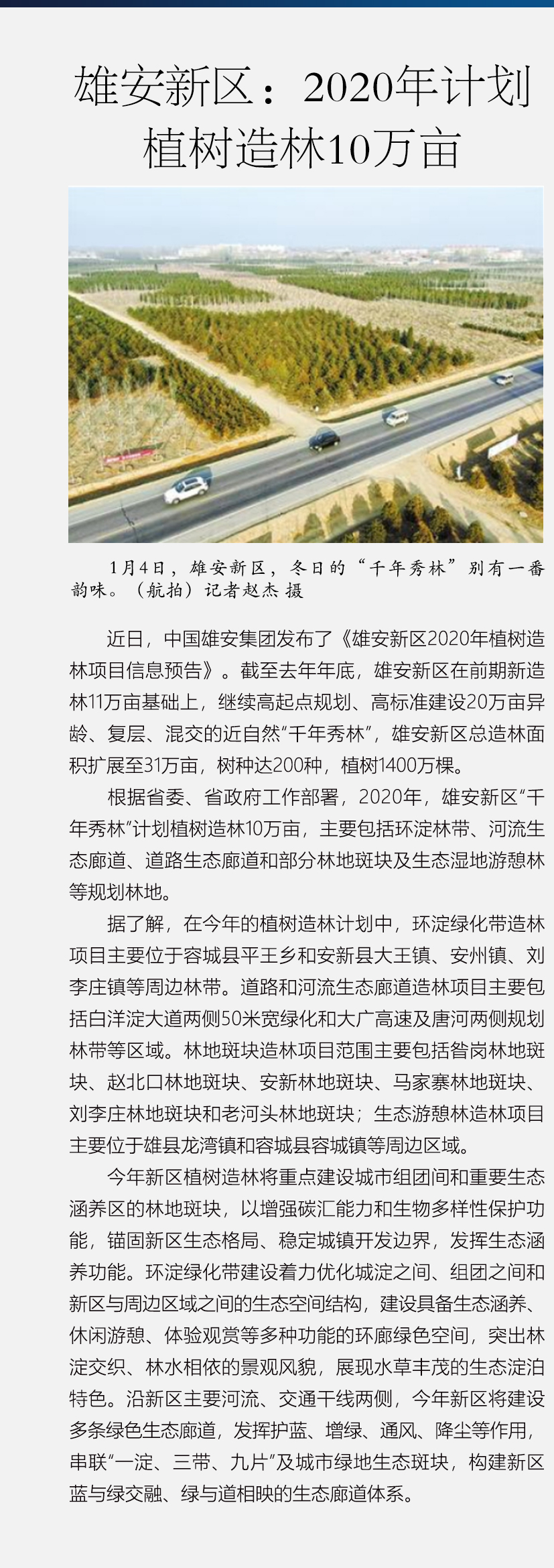 2020年,雄安新区“千年秀林”计划植树造林10万亩,主要包括环淀林带、河流生态廊道、道路生态廊道和部分林地斑块及生态湿地游憩林等规划林地。