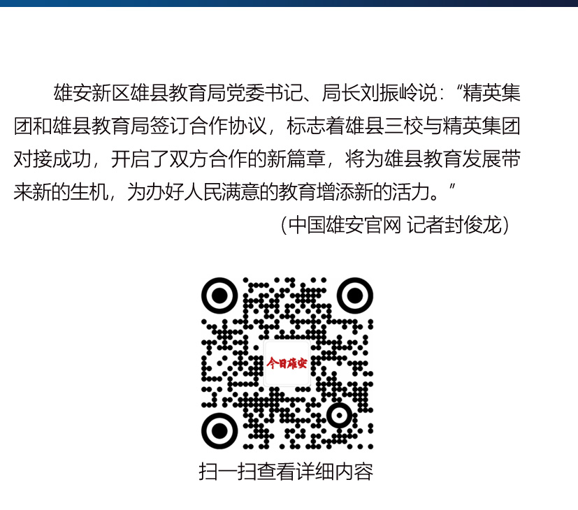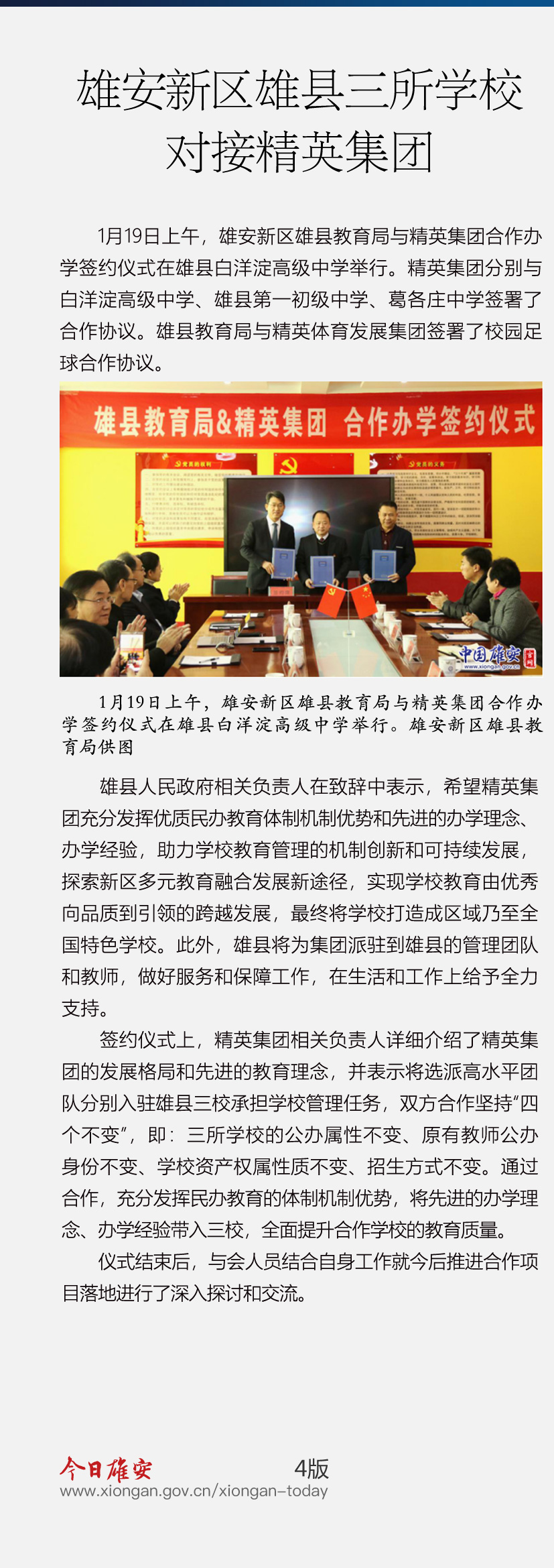 精英集团分别与白洋淀高级中学、雄县第一初级中学、葛各庄中学签署了合作协议。雄县教育局与精英体育发展集团签署了校园足球合作协议。
