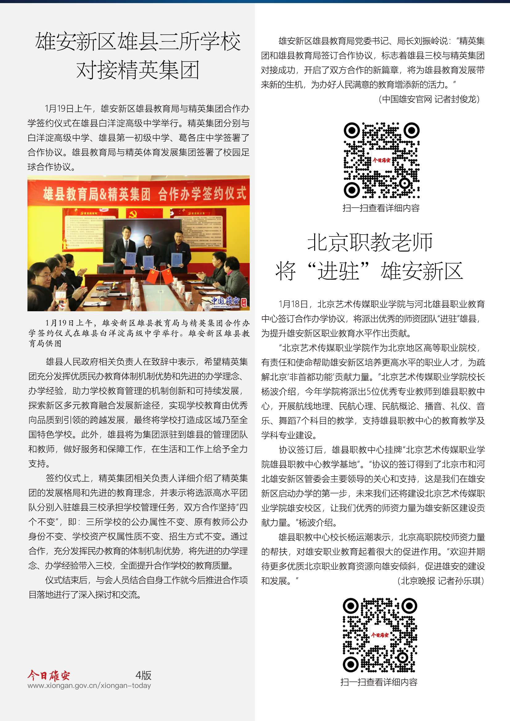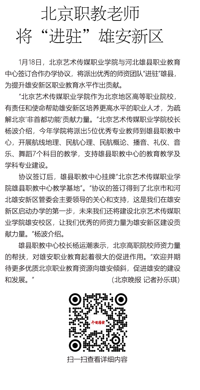 1月18日,北京艺术传媒职业学院与河北雄县职业教育中心签订合作办学协议,将派出优秀的师资团队“进驻”雄县,为提升雄安新区职业教育水平作出贡献。