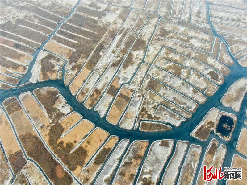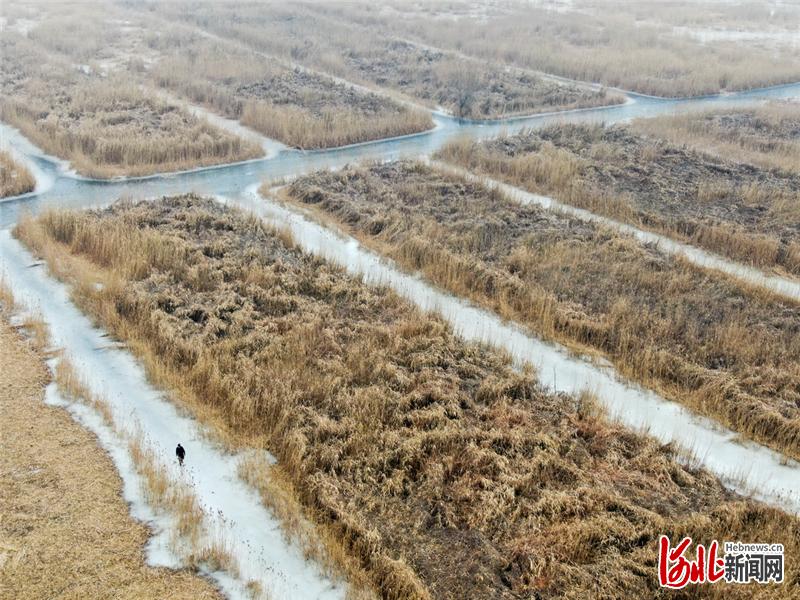 1月5日,无人机拍摄的白洋淀。时值寒冬,白洋淀坚冰如玉、芦苇无边、寒鸟飞鸣,大片的芦苇与纵横交错的水道,生动地组织起一幅幅靓丽的图画。记者赵杰摄