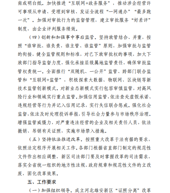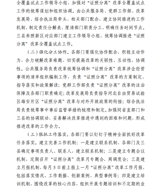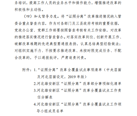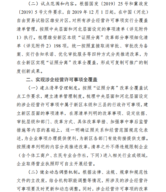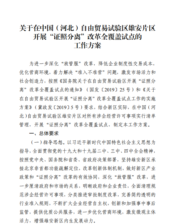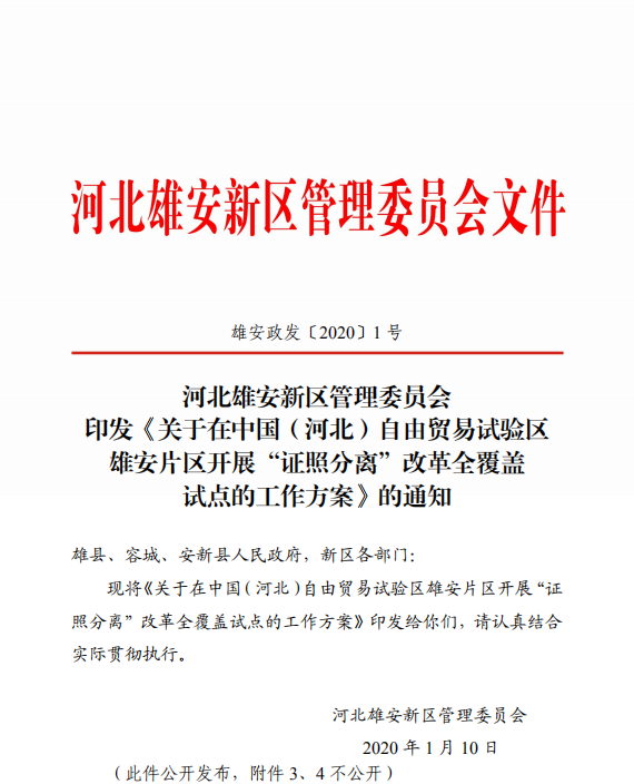 河北雄安新区管理委员会印发《关于在中国(河北)自由贸易试验区雄安片区开展“证照分离”改革全覆盖试点的工作方案》的通知