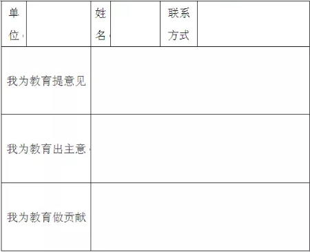教育系统广大教职员工请积极参与、实名建言,说出自己的心里话,说出自己的真心话,用真心、真情为雄县教育的发展建言献策。《“我跟局长说”建言献策表》填好后,自己用信笺密封,各乡镇中心校、局直各单位统一收集。1月31日(正月初七)之前,教育局将派专人到各单位收取,并全程保密、直接交局长,局长会一封一封地看,一件一件地记,一个一个地采纳。对所提建议被纳入《全县2020年教育提升年活动指导意见》的教职员工,将进行全县通报表扬,并给予一定的物质奖励。